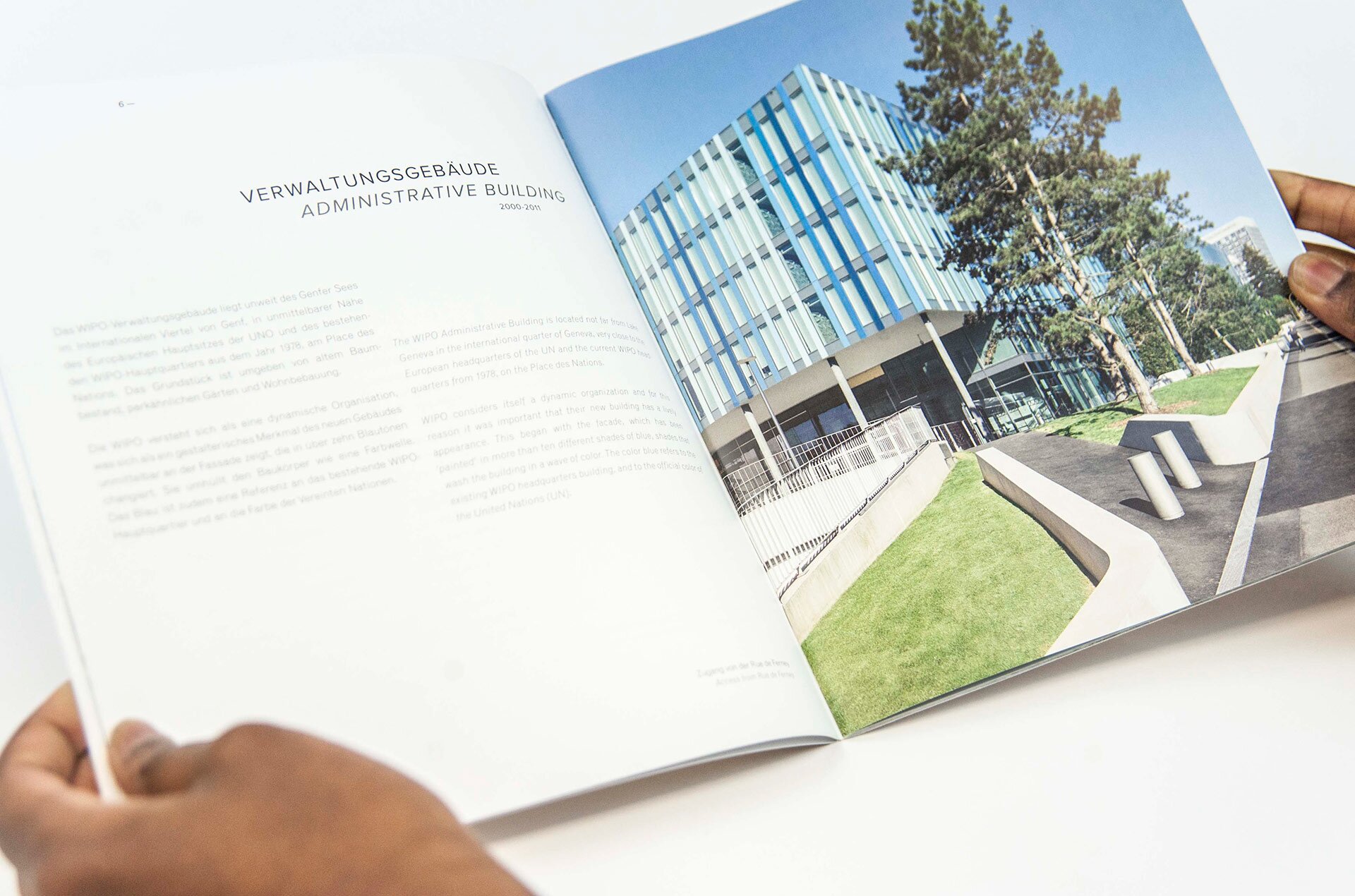 In the year 2000 plans were already well underway to set up the World Intellectual Property Organization (WIPO), an international organization responsible for protecting intellectual property, based in Geneva. The competition for one building in the end resulted in three new buildings linked together, the WIPO Campus, which is presented in this booklet: an administration building, completed in 2011, a conference hall and a smaller reception building, both opened in 2014.