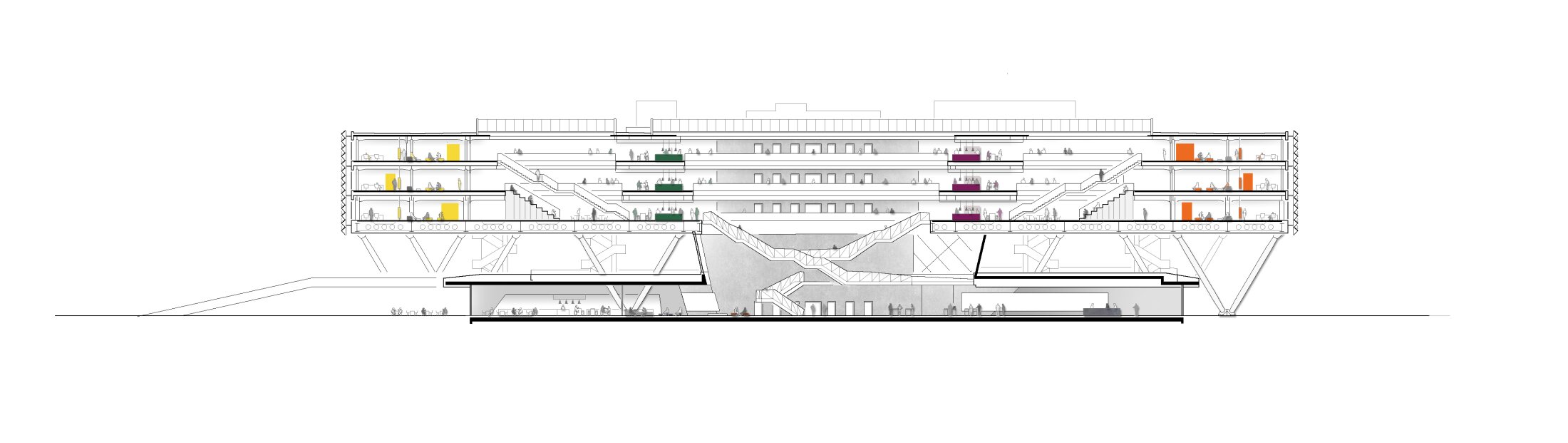 The heart of the structure is the dramatic floating staircase in the atrium. Rising through the spacious light well, it takes employees up to the three-story workspace section and offers exciting views into the atrium, across the open-air level out over the campus, and up to the office floors. A central main street links these three levels both vertically and horizontally, creating a vibrant space in mid-air. On each floor, this circulation area is adjoined by six kitchen hubs that serve as metaphoric cities. These hubs are characterized by distinctive materials, colors, and furnishings, giving each an individual identity within the building. Work areas alternate with spaces for formal and informal meetings, as well as recreational zones. They are organized as clusters around light wells of different sizes optimized to supply ample natural light.