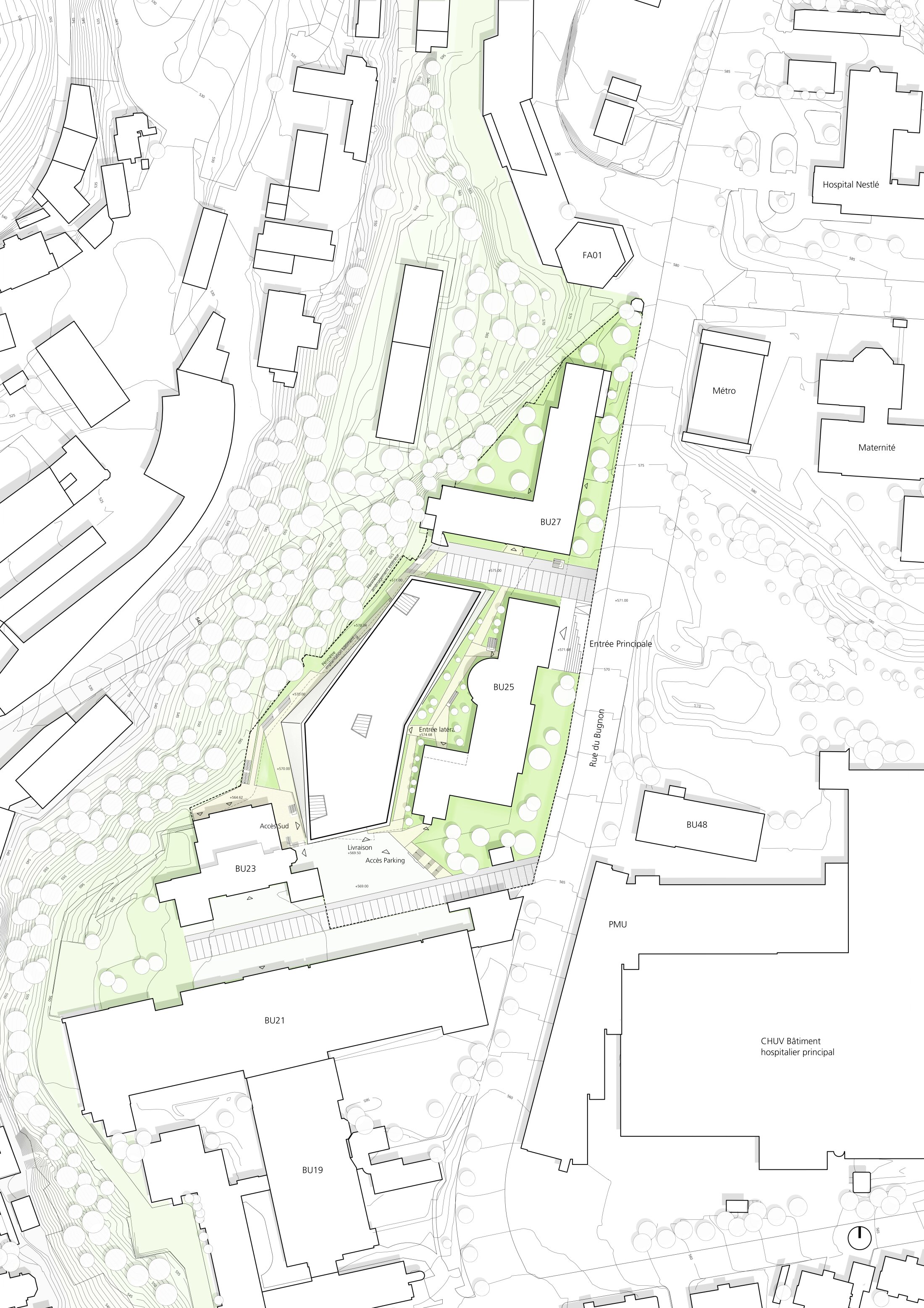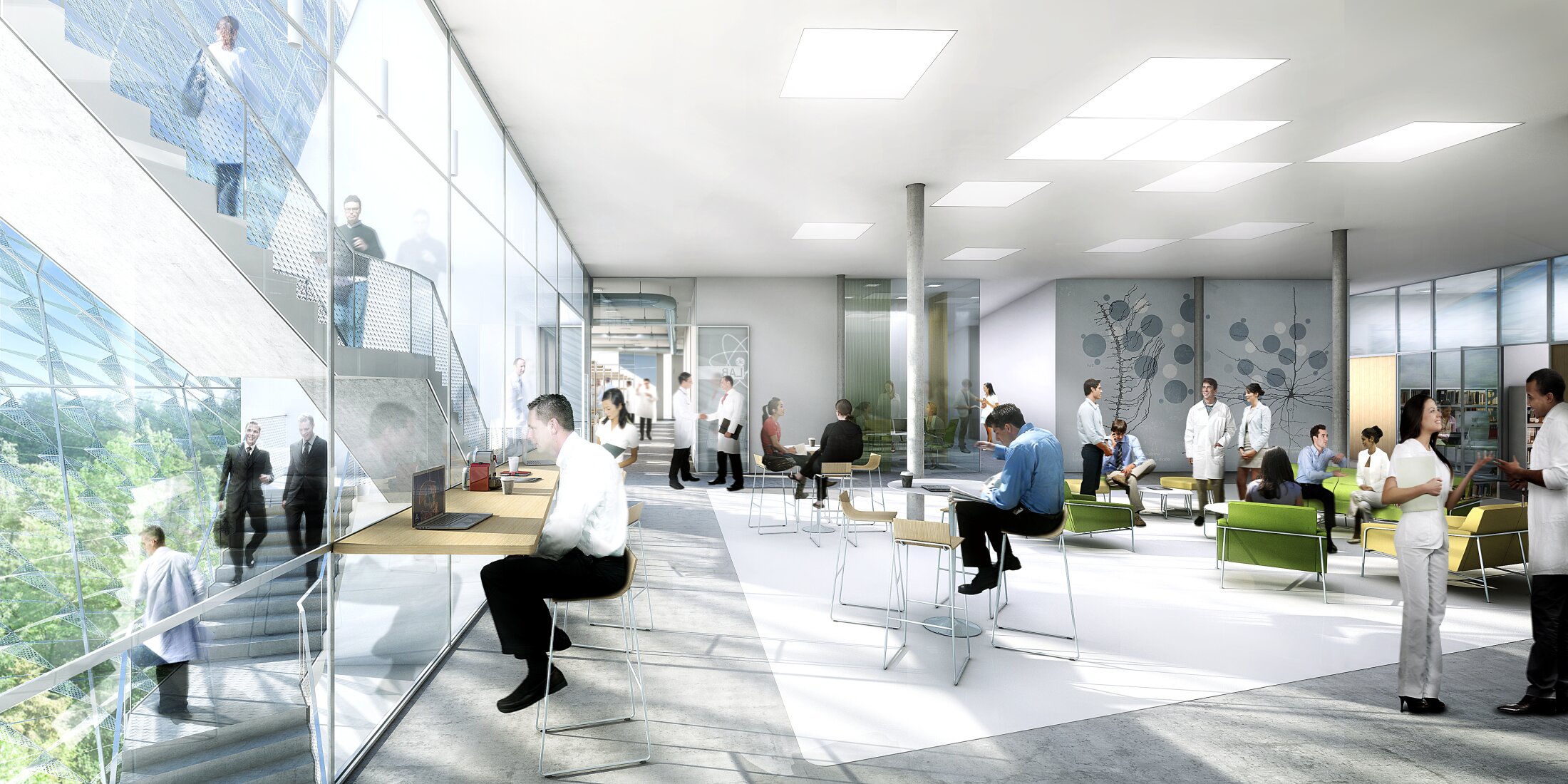 Existing circulation routes and visual connections across the campus are preserved and integrated into the design. Pathways are extended through and around the building, strengthening connectivity and interaction. Key sightlines are maintained, supporting orientation and collaboration while opening views toward the valley and between new and existing structures.