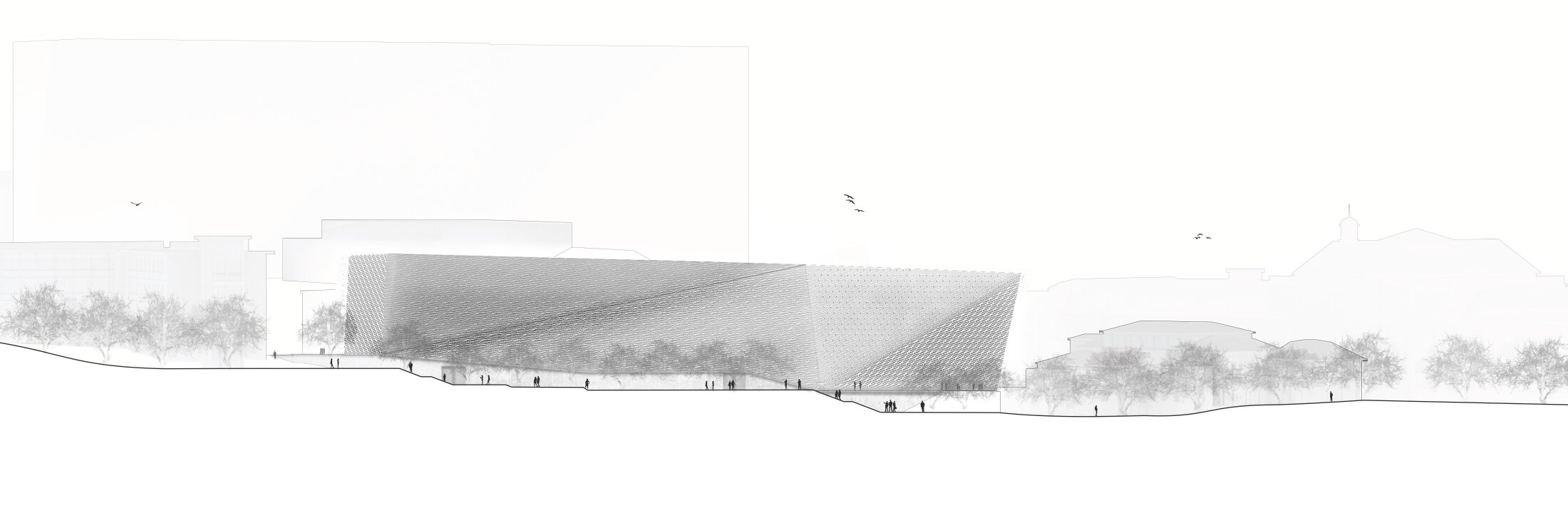The site is characterized by loosely arranged buildings of varying scale and style, as well as a steep, tree-covered slope that limits development. The required building volume is substantial, making integration challenging. The design therefore prioritizes orientation toward the landscape and views, while minimizing negative impacts on neighboring structures and maintaining daylight access to surrounding spaces. Rather than adopting existing forms, the building develops an independent geometry shaped by internal functional relationships and site conditions. Its configuration allows for a clear spatial identity while remaining responsive to the context.