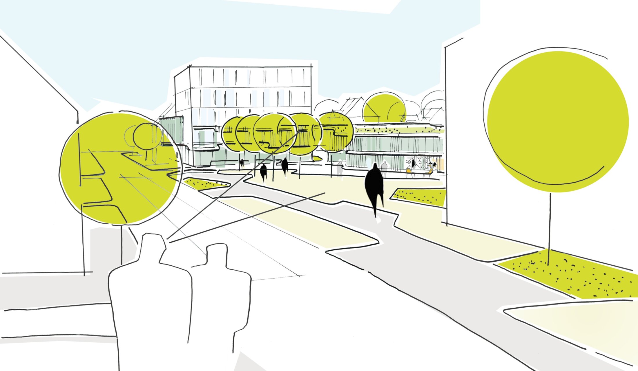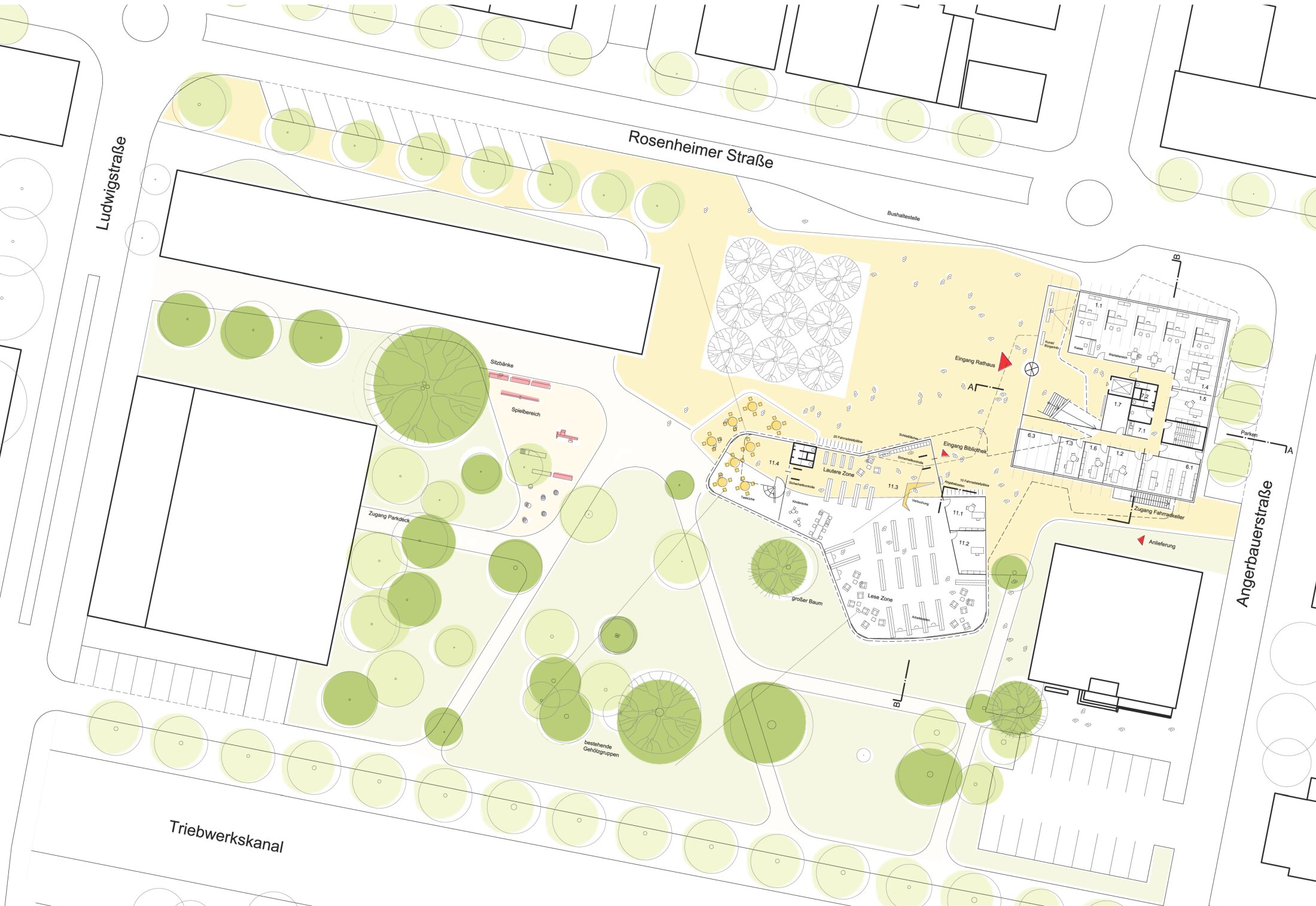 The new town hall square is conceived as a generous, barrier-free public space with natural stone paving, suitable for everyday use and events. It connects seamlessly to the adjacent park, which retains its mature trees and open character while being enhanced through new pathways, seating areas, and a playground. Together, square and park form a continuous civic landscape that encourages social interaction and strengthens the identity of the city.