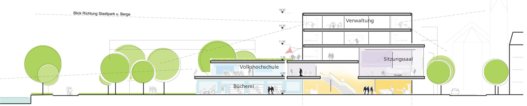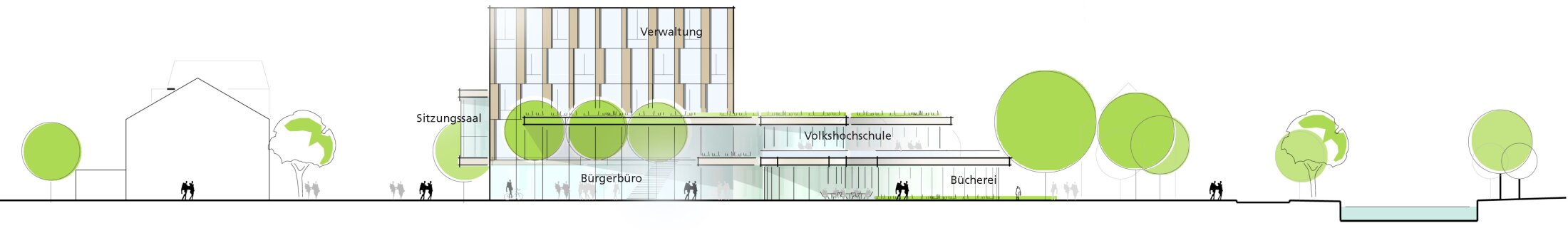 A curved two-storey base integrates public functions such as library, adult education, council hall, and ceremonial spaces, linking street, square, and park into a continuous urban landscape. Above, a five-storey administrative volume forms a distinct landmark and defines the eastern edge of the town center.