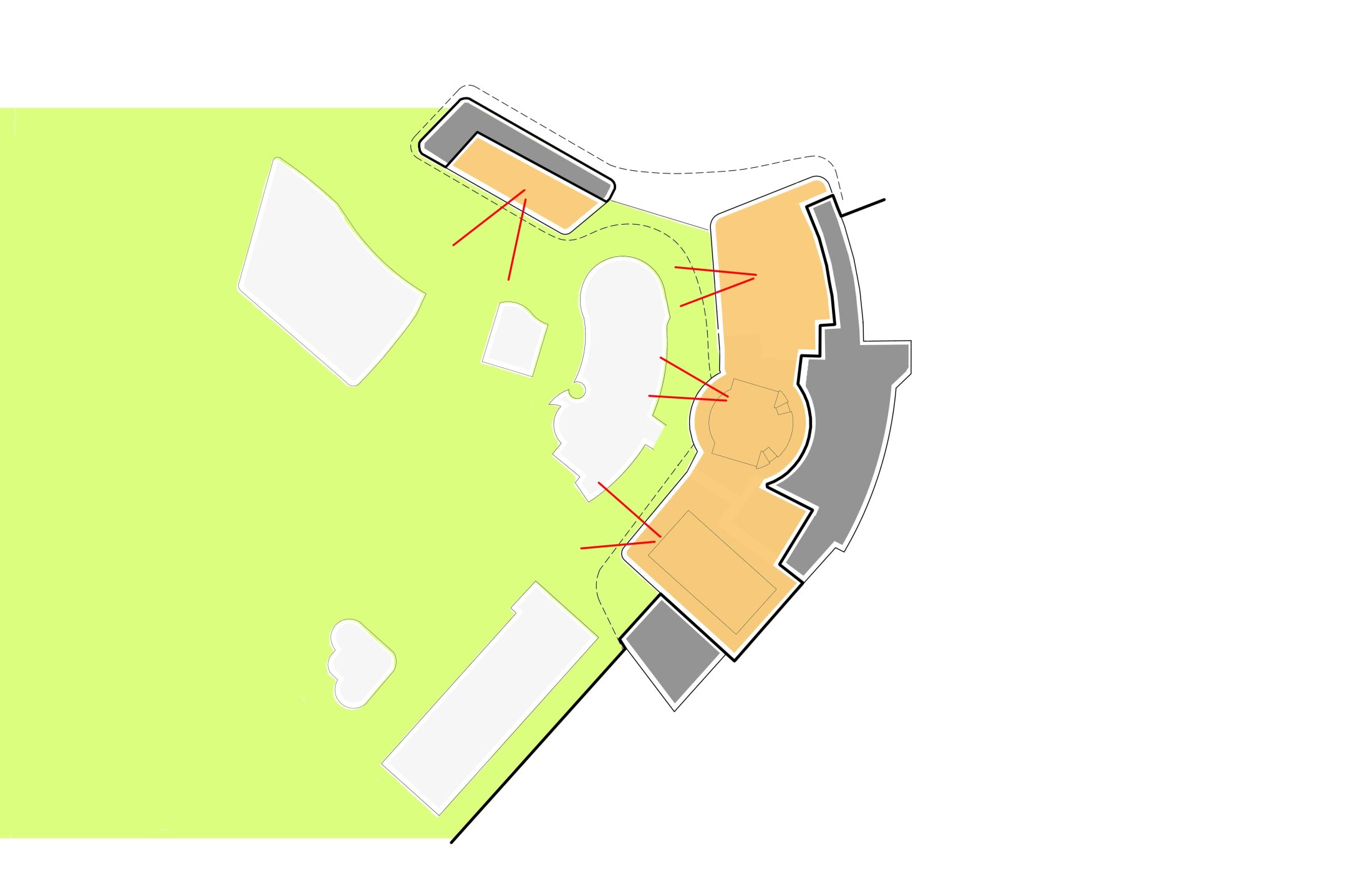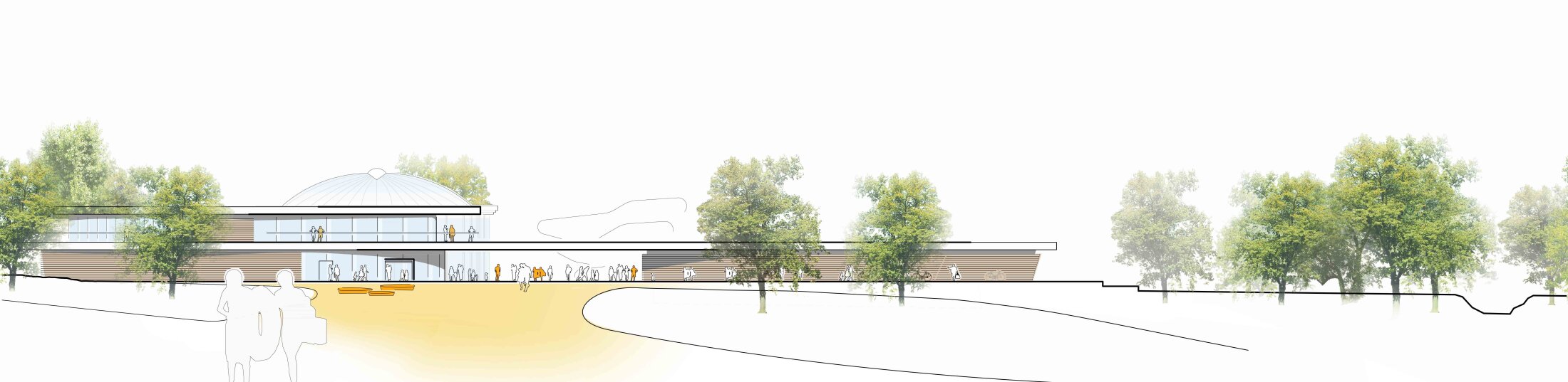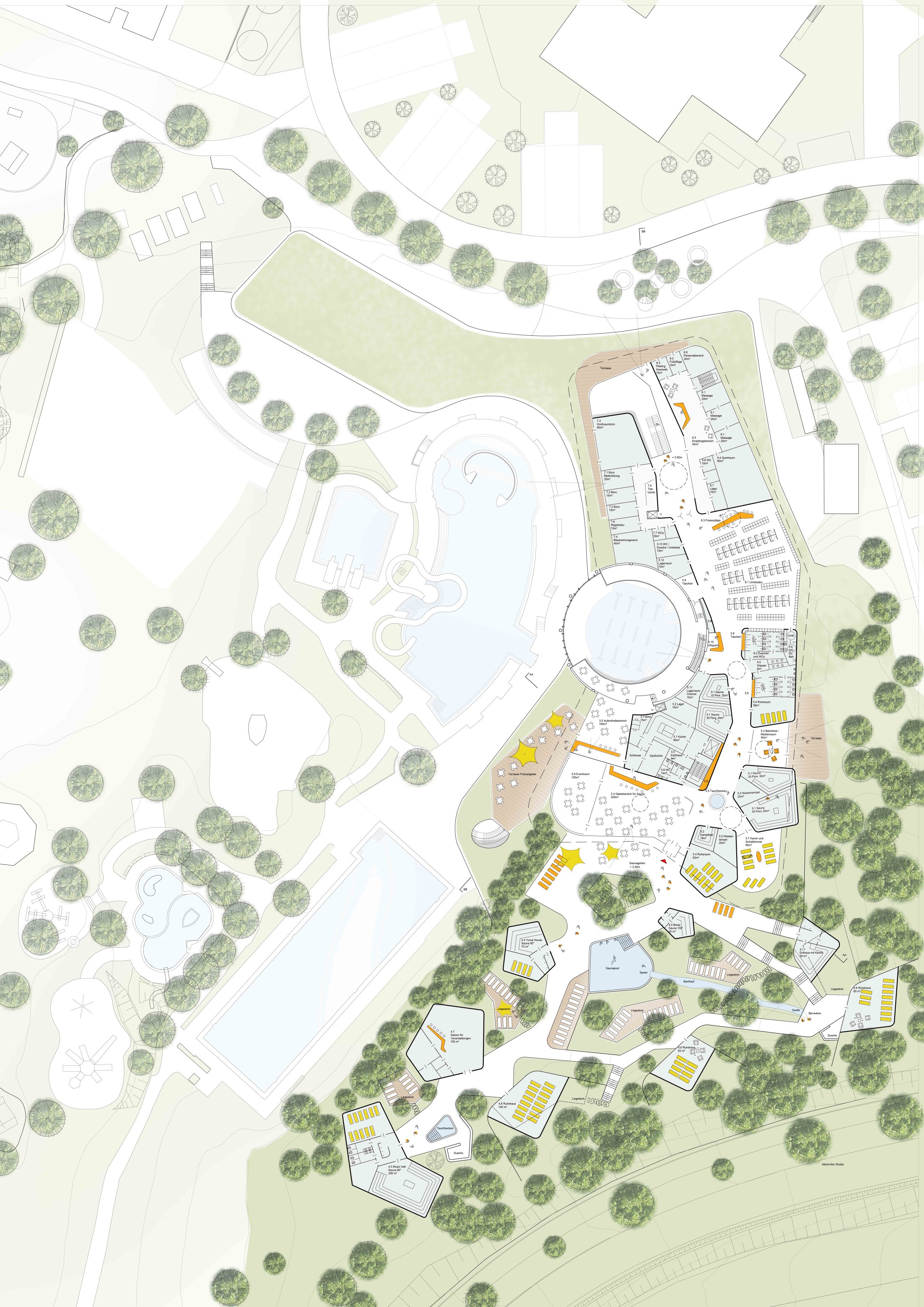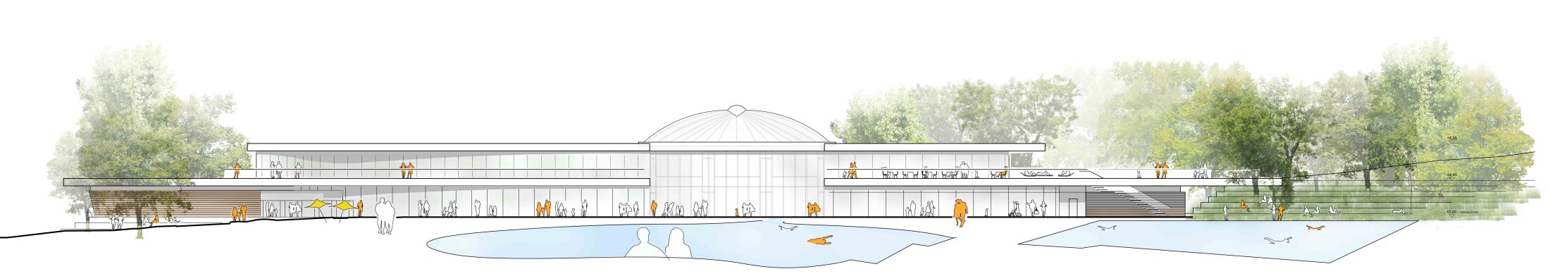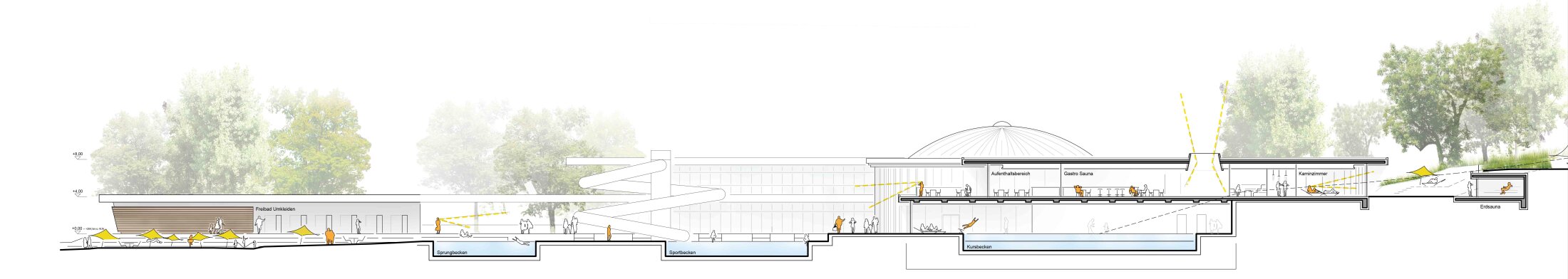 A reorganized foyer ensures clear orientation and access to all areas, while flexible pool zones allow simultaneous use by schools, clubs, and the public. The sauna and wellness areas form an independent yet connected zone with direct access to landscaped gardens. New terraces, outdoor spaces, and visual connections enhance the bathing experience and strengthen the relationship to the surrounding nature.