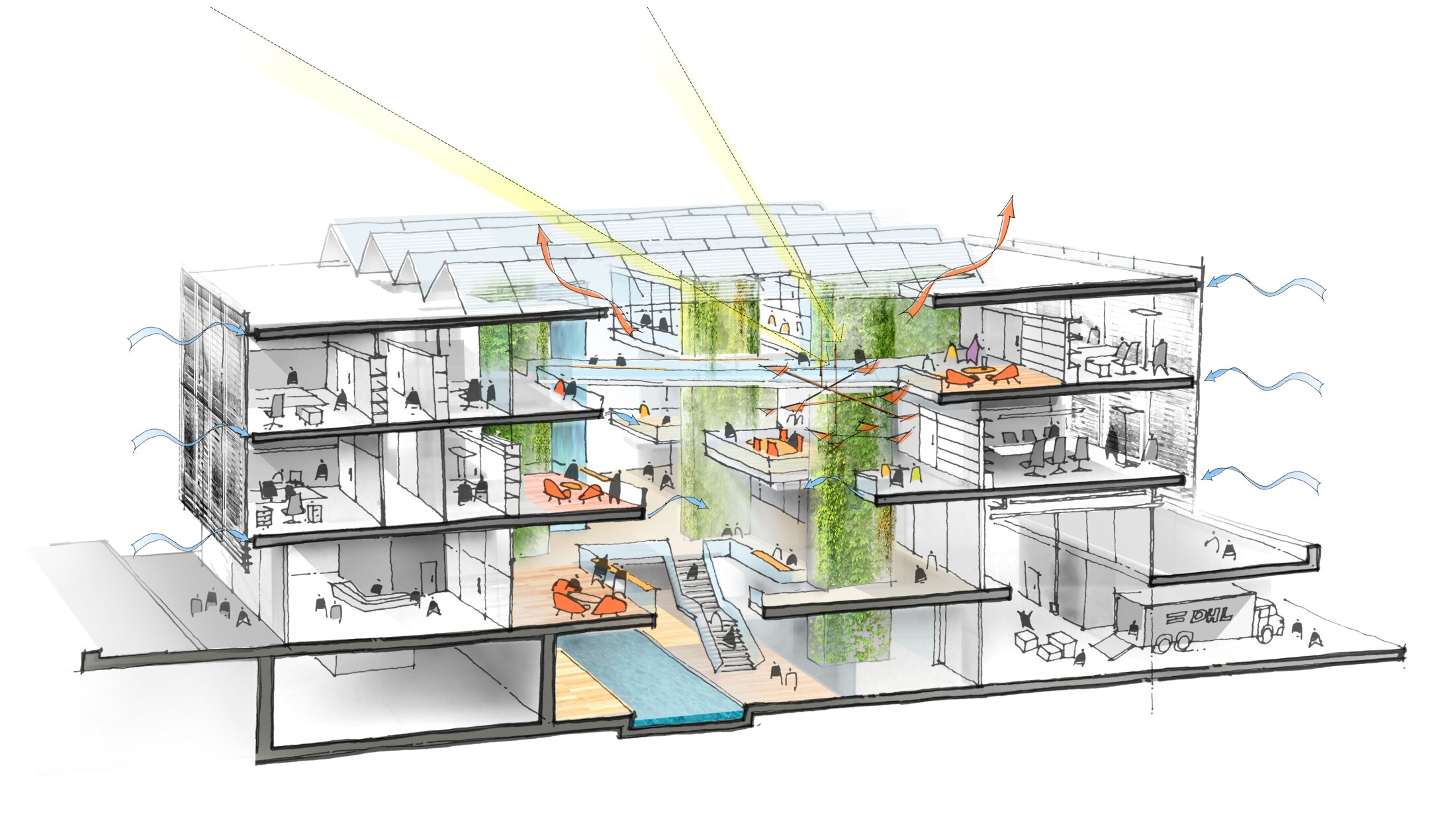 From the outset, the client expressed a clear desire for a series of highly efficient and ecologically responsible buildings. Accordingly, each building integrates a range of strategies to ensure a healthy and pleasant working environment while maintaining a strong commitment to sustainability. The workspaces rely on natural ventilation. In addition, cold air is flushed at night, and heat is recovered from the exhaust system. All materials meet the regulations of the French HQE (Haute Qualité Environnementale). Inside the atria, vertical ”green gardens” provide sound absorption, help regulate humidity, and create a pleasant, relaxing ambience for people in the interior.