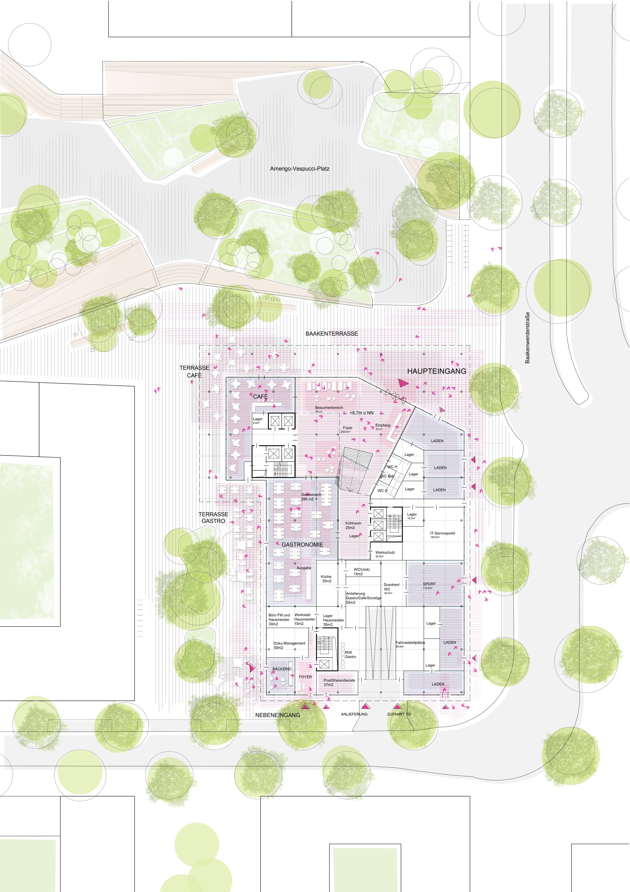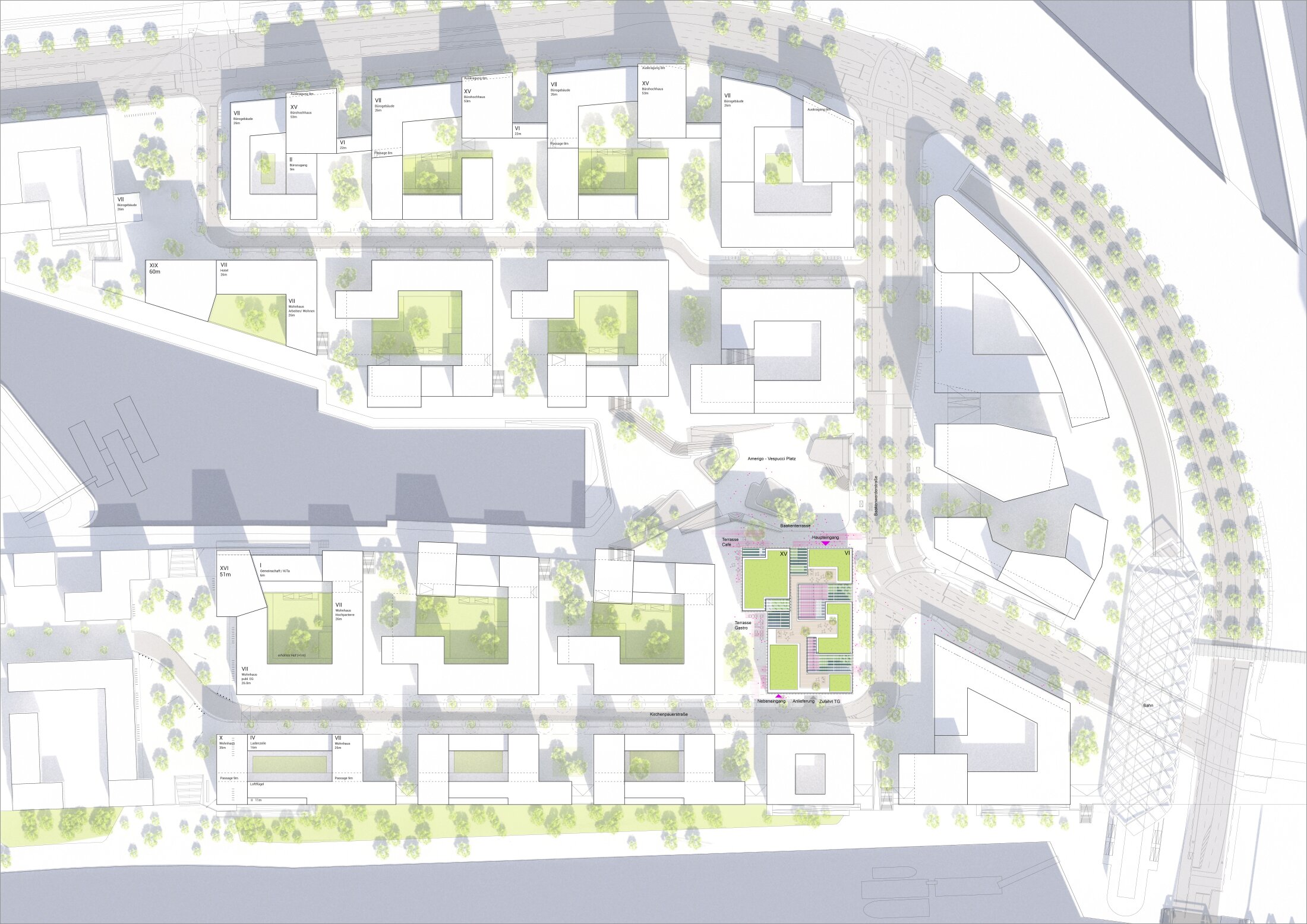 Based on the masterplan defining perimeter blocks and high-rise elements, the design develops a mixed-use office building adjacent to Amerigo-Vespucci Square, activating the urban entrance to HafenCity. The building is conceived as a three-dimensional, open structure organized around a central foyer and a vertical “town hall” circulation space. Public functions at ground level like retail, gastronomy, fitness, and service, activate the streetscape and connect the building to its surroundings.