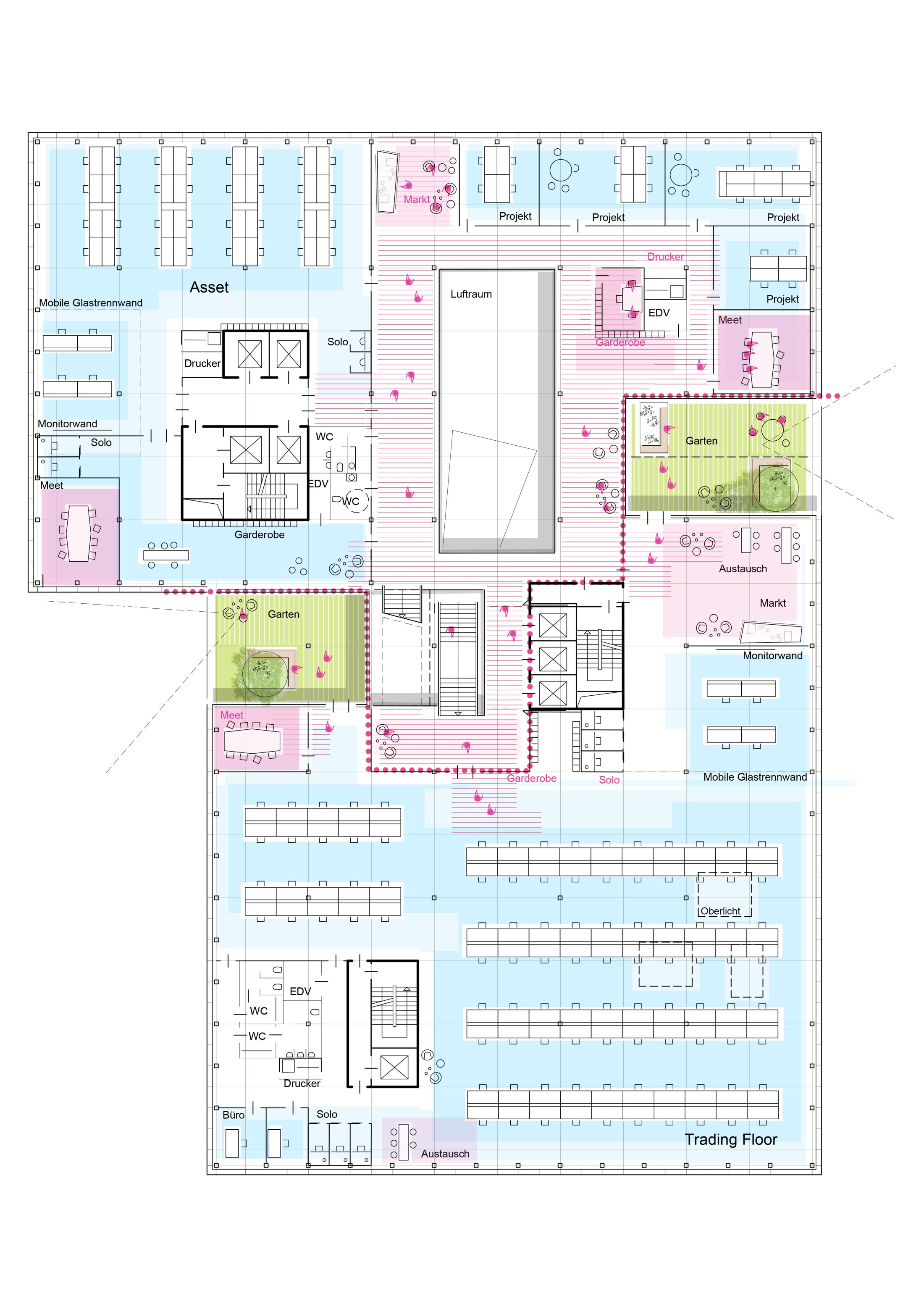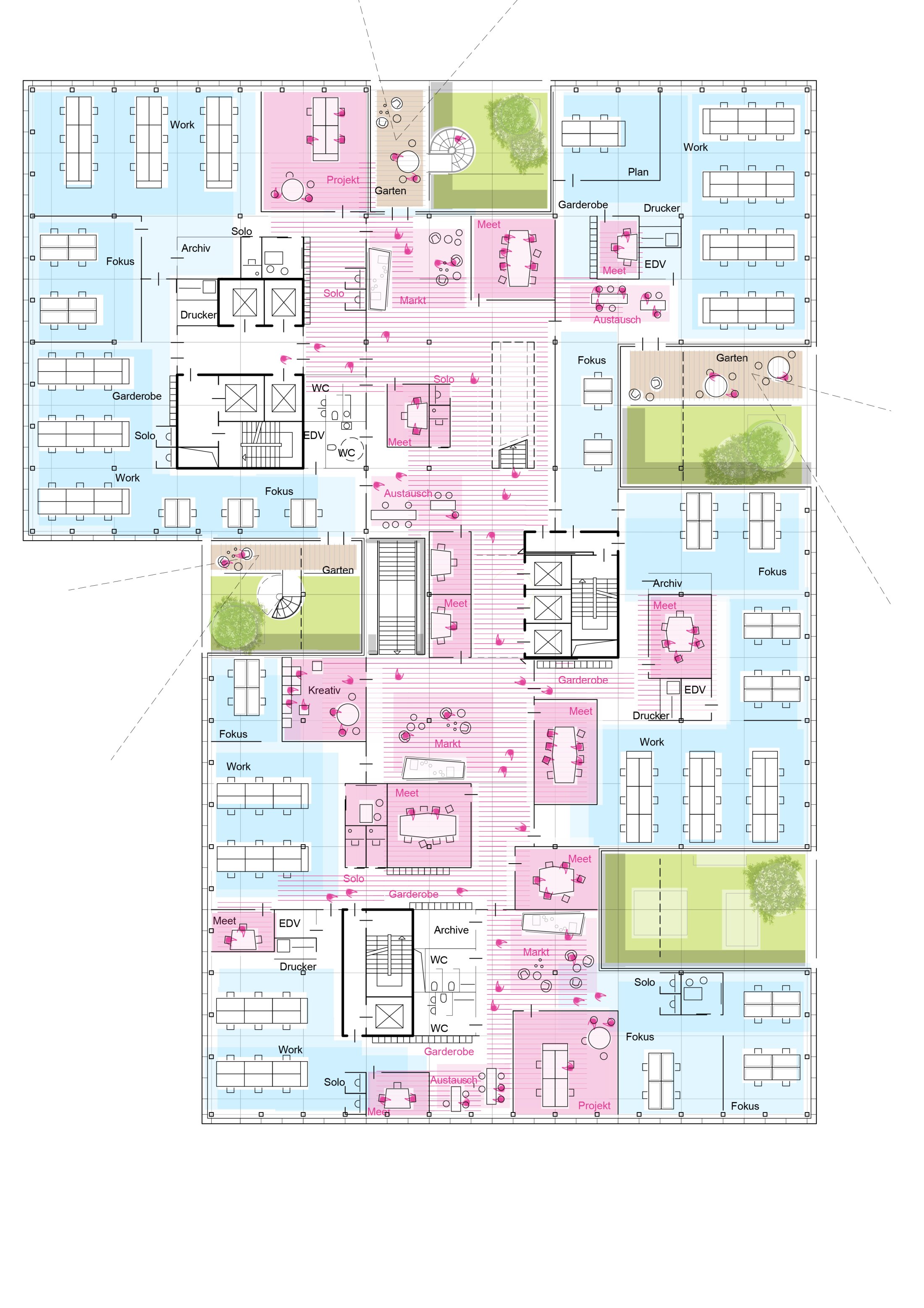 Upper office levels follow a flexible, open-plan system rather than traditional cellular layouts, allowing adaptable work environments. Internal staircases and double-height spaces create vertical connections and encourage interaction across floors. Integrated gardens and buffer zones structure the building, offering informal workspaces, improving microclimate, and enabling natural ventilation. These green elements mediate between interior and exterior while enhancing user comfort. Roof terraces and landscaped areas extend usable space and reinforce the building’s identity as a dynamic, vertically connected organism. The result is a flexible, transparent, and future-oriented workplace embedded in its urban context.