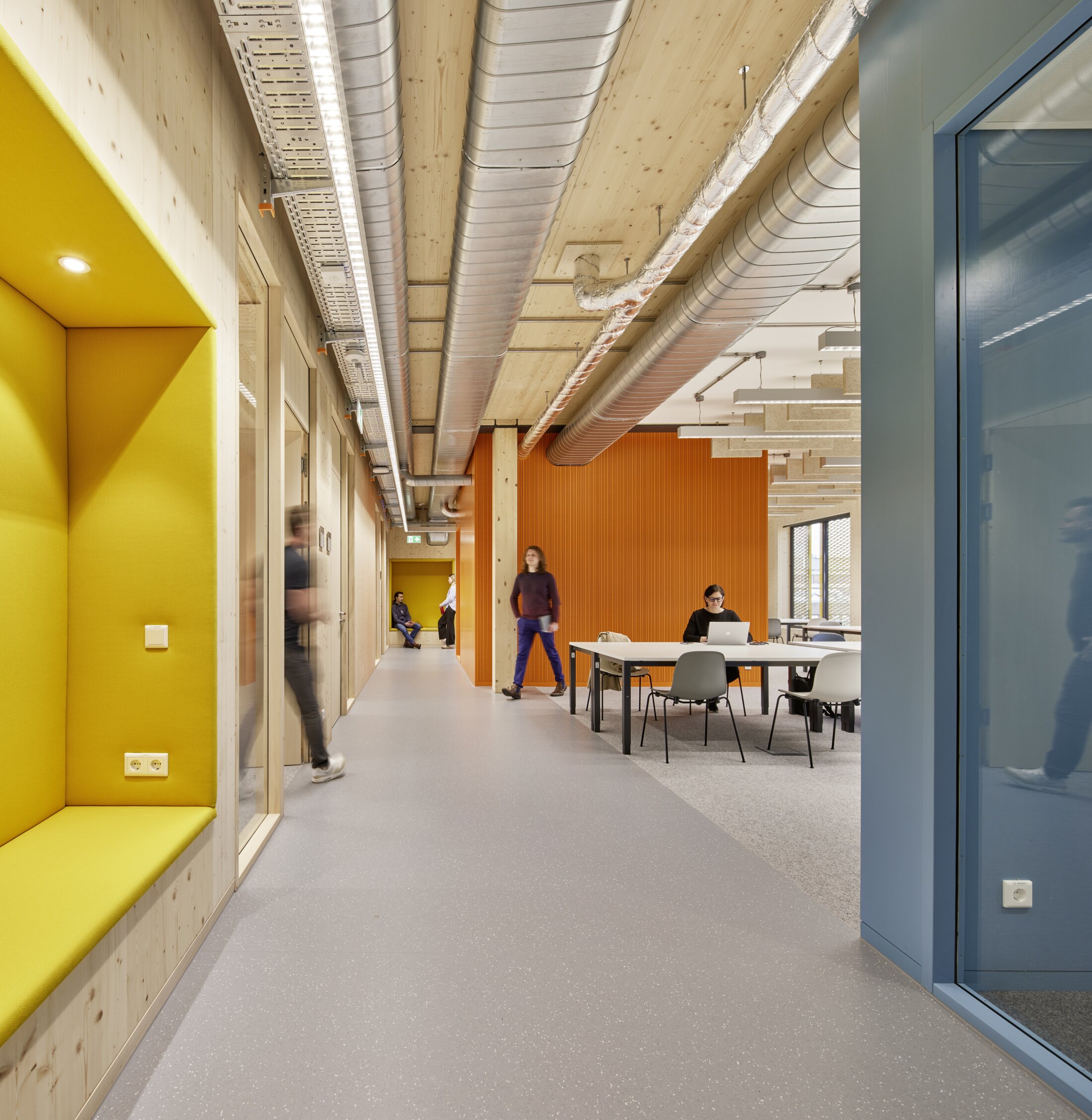 The extension offers new offices for the business faculty as well as open space and creative areas for all students. The Münster UAS has around 592 square meters more space available at this location. Visually, the new fifth floor is set apart by a striking façade with fixed solar shading made of expanded metal, which reduces solar heat gain in summer.
