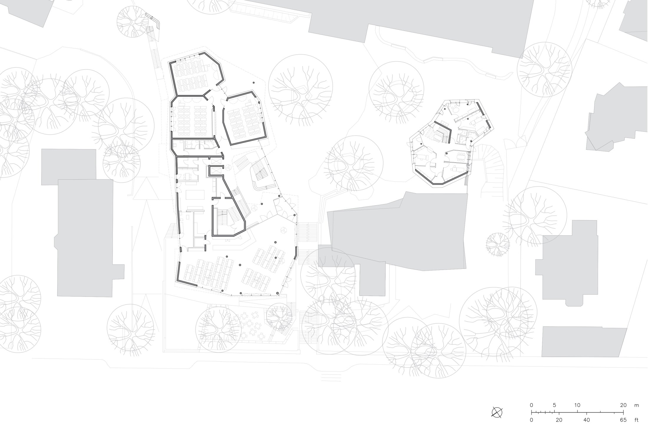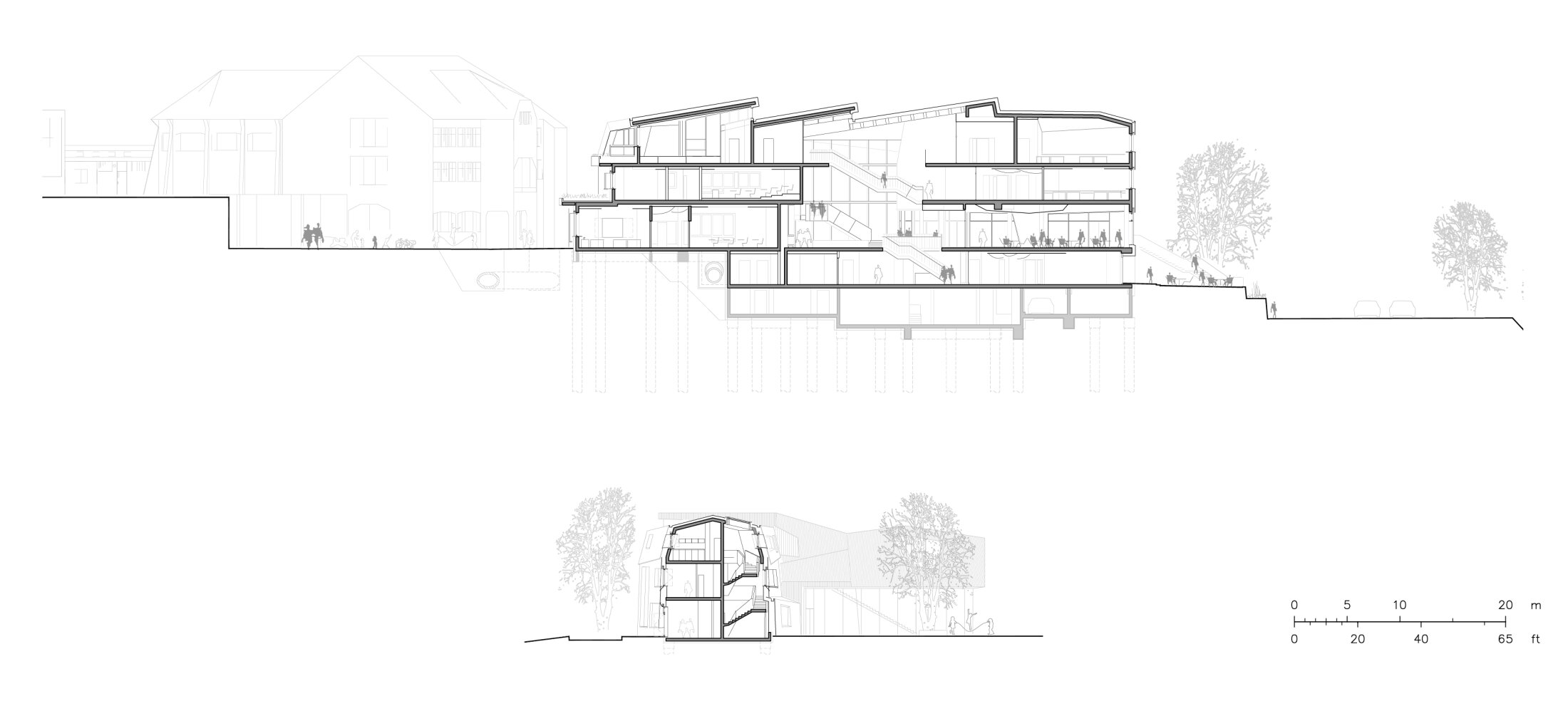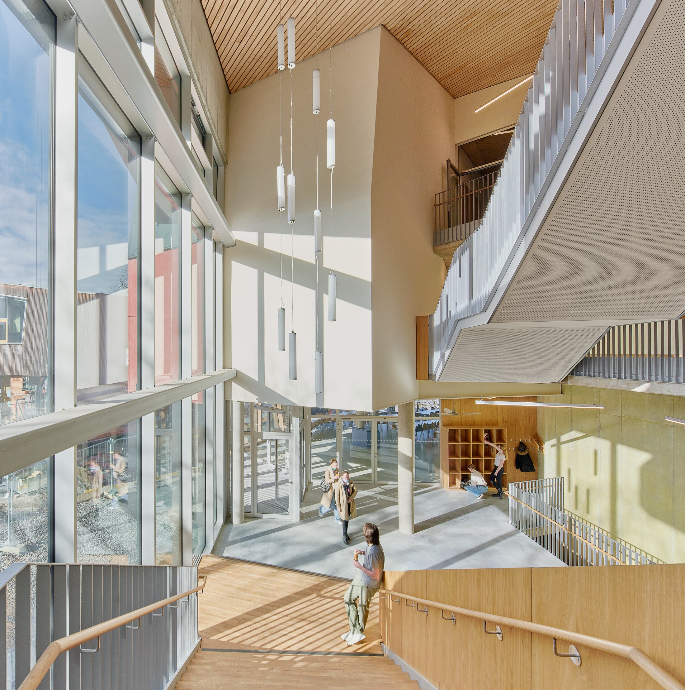 Following the slope of the hill, the building responds to adjacent structures, creating a harmonious architectural dialogue. At its core, a transparent atrium functions as a multi-story vertical schoolyard, extending the school’s outdoor environment inward.