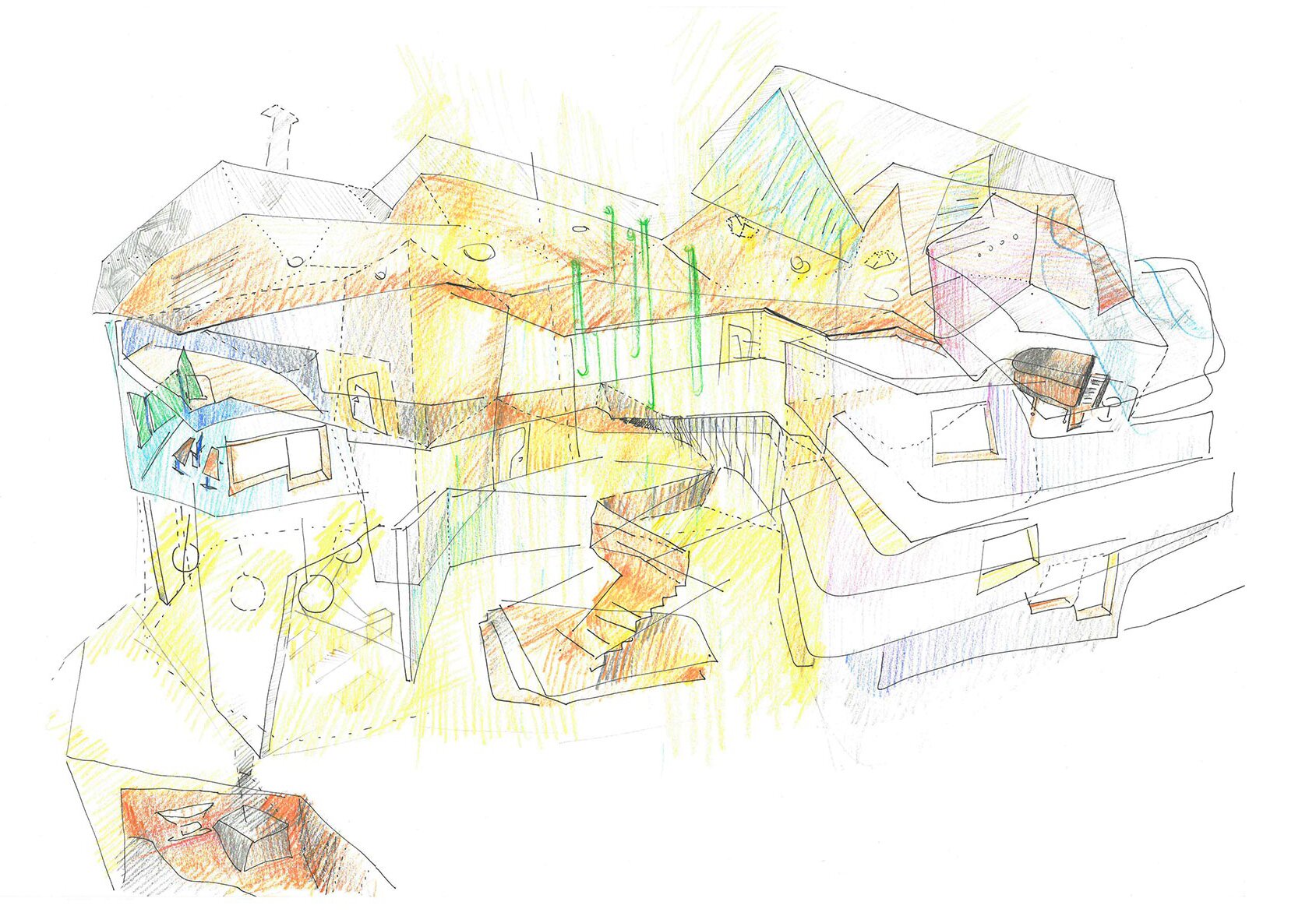 The distinctive black roof—composed of four folded, polygonal segments—echoes the varied roofscape of the campus, including a brutalist performance hall. Its form and the mansard geometry are shaped by local building codes, while its black surface results from integrated solar panels that seamlessly blend into black sheet metal. The red color of the northwestern part nods to the prevailing color scheme of the buildings on campus and enhances visibility from afar.