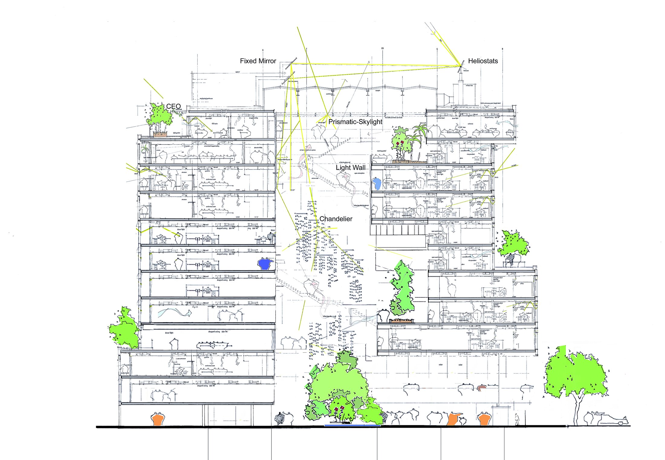 All workstations are naturally illuminated through a combination of re-directional blinds along the building’s perimeter and the top-lit central atrium. Above the atrium, a sunlight redirection system—featuring heliostats and fixed mirrors—further enhances daylight levels throughout the interior. Daylight is carefully filtered through a prismatic ceiling beneath the skylights, then diffused into the interior through reflective devices such as the sparkling chandeliers and the light wall with chrome elements that wraps the atrium core.