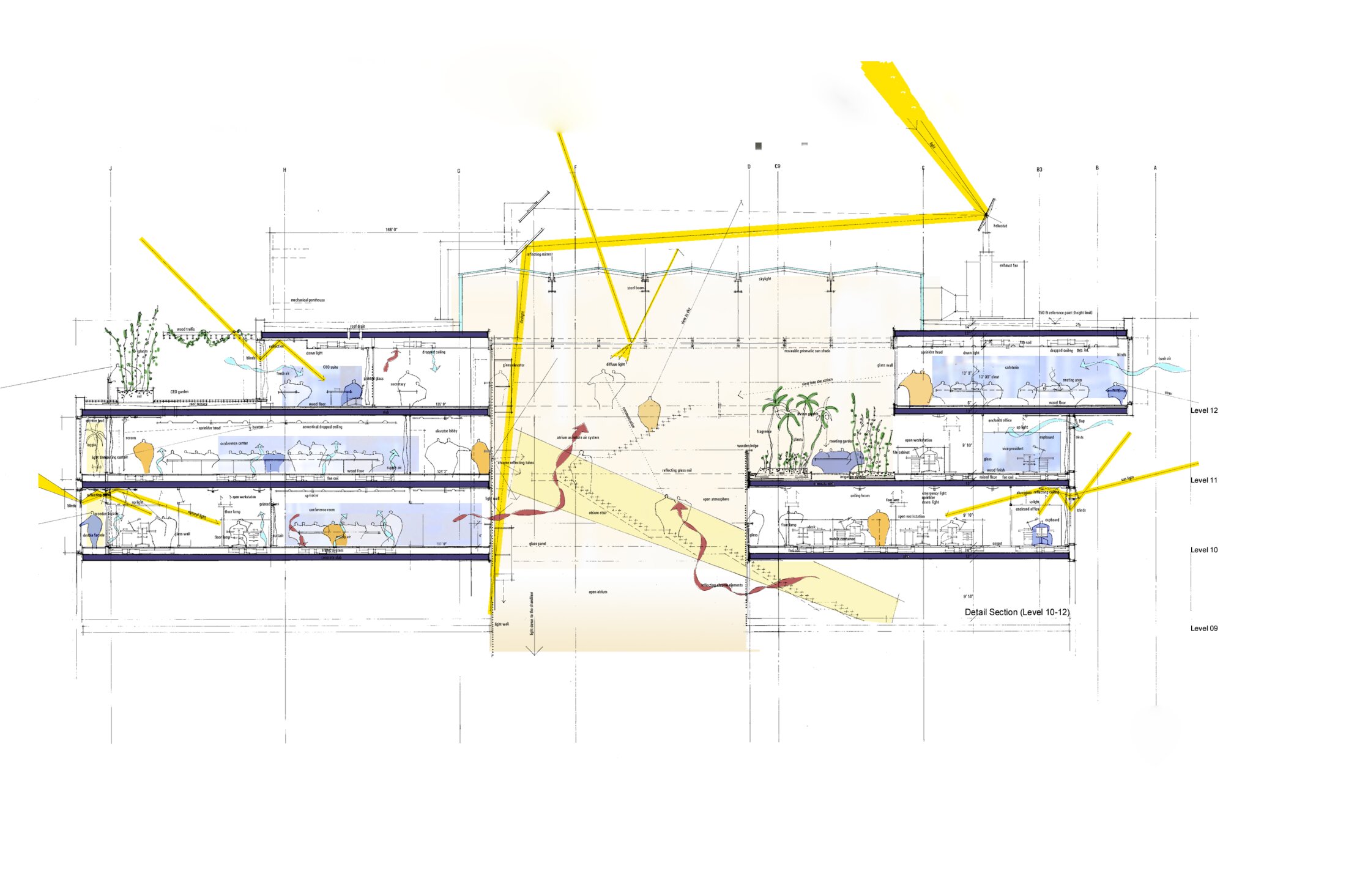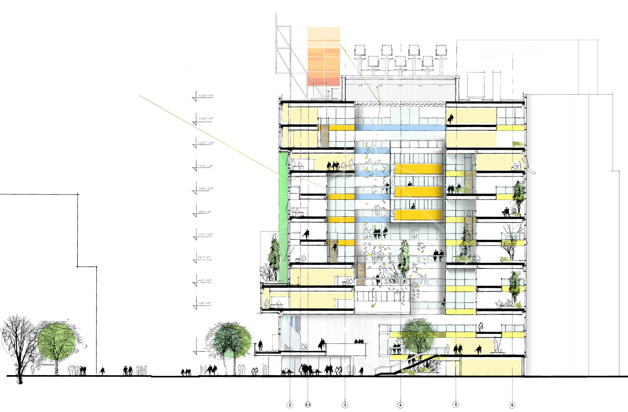 Organized as a vertical city with individual dwellings, public areas and indoor gardens extend up the full height of the central atrium, a space serving as a large return air duct and light shaft. Open stairs form part of a vertical boulevard, which starts at the ground floor lobby before proceeding upwards through various neighborhoods with open workstations and separate offices.