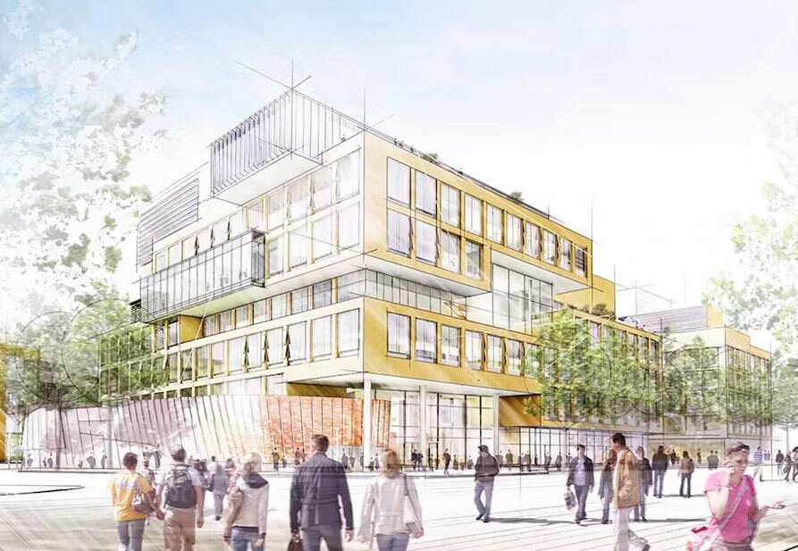 The building is organized into three interconnected volumes linked by multi-storey glazed atria, which serve as light-filled social hubs. Teaching spaces, makerspaces, and public functions are located at lower levels, engaging the urban context, while flexible classrooms support a range of learning formats. Research laboratories are arranged in the upper levels, providing adaptable and modular environments for long-term use. Generous shared spaces between lab areas encourage interaction and interdisciplinary exchange among students and faculty.