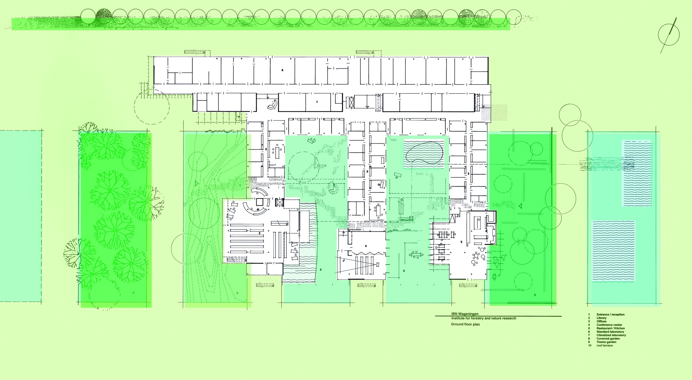 The functional areas are logically organized and interconnected in several ways. The laboratories are located in the longer building to the north, while the offices occupy three wings to the south. Covered gardens are positioned between these office wings, serving both as access and as gathering spaces. These gardens accommodate a variety of uses, including spaces for informal and social functions.