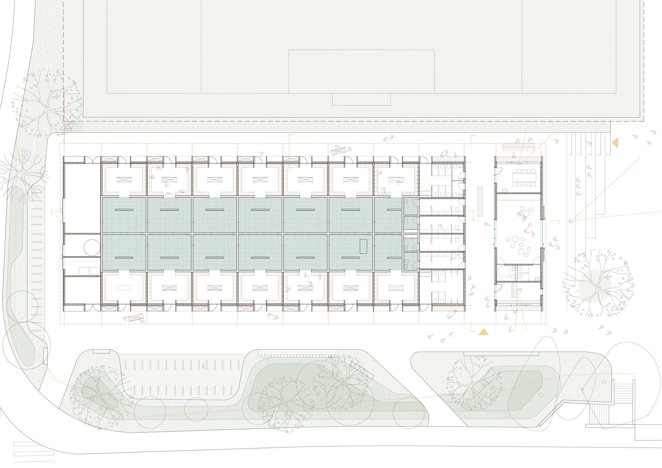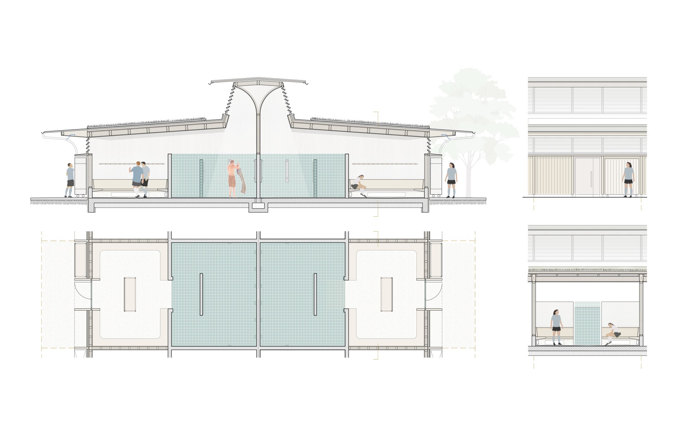 A compact “back-to-back” layout places climate-sensitive spaces at the core, surrounded by changing rooms with external access, while circulation is organized as covered outdoor space to reduce heated volume and create an open, all-sided building. The single-storey structure ensures direct access, clear orientation, efficient maintenance, and simple compliance with safety standards, while also providing barrier-free use and natural lighting.