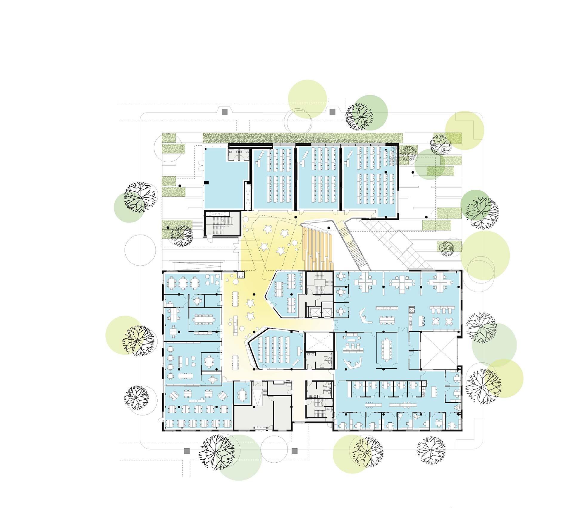 Centered around a five-story glass atrium animated with activities, the School of Business benefits from a diverse program. A wide range of spaces—informal meeting and study areas, gardens, classrooms, business incubators, student spaces, faculty and administrative offices, and retail—are strategically arranged to maximize communication and connectivity, promoting an inclusive approach to learning. Flexible, student-focused informal learning spaces are evenly distributed throughout the building, acting as social anchor points that transform a transitional corridor into a pedestrian-friendly space for students and the greater University community.