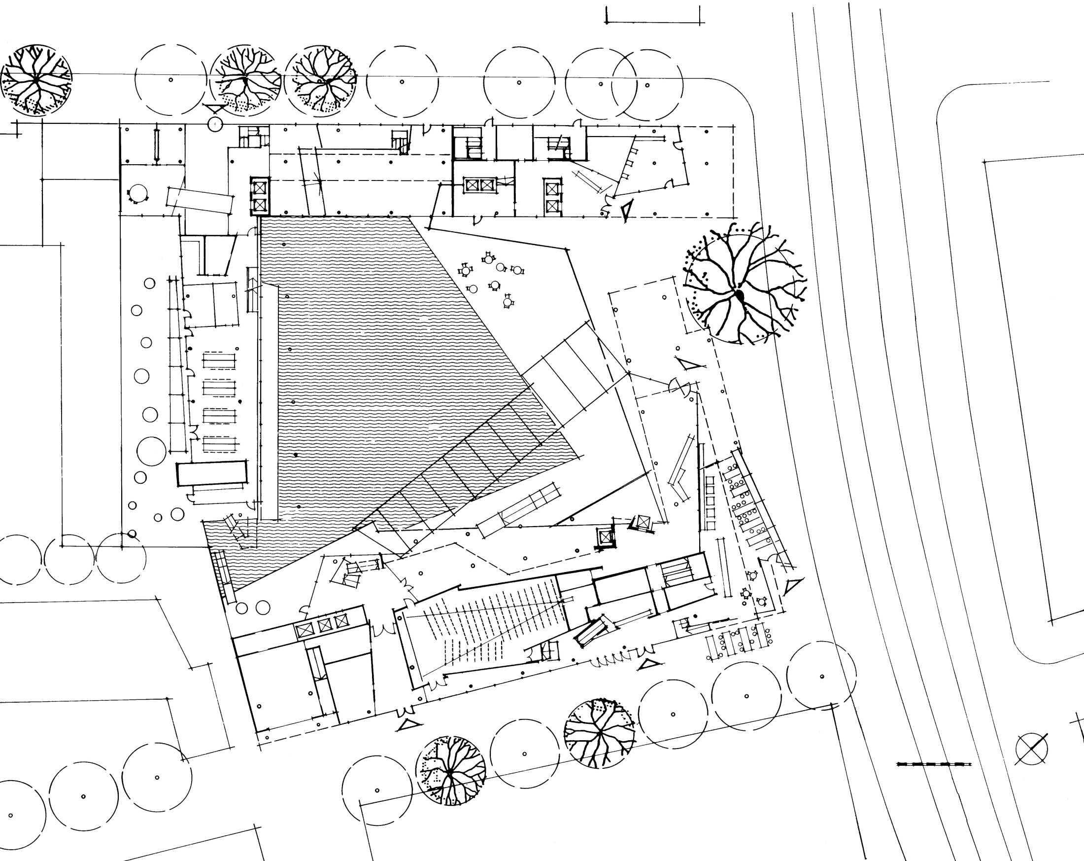 The five-story perimeter building responds to the eave heights of its neighbors. Above this, three additional stories step back to minimize impact on the surrounding streets—except for a lounge for friends of the Landesgirokasse, which projects over the street. The setbacks create a series of roof terraces and gardens and contribute to a more interesting skyline.