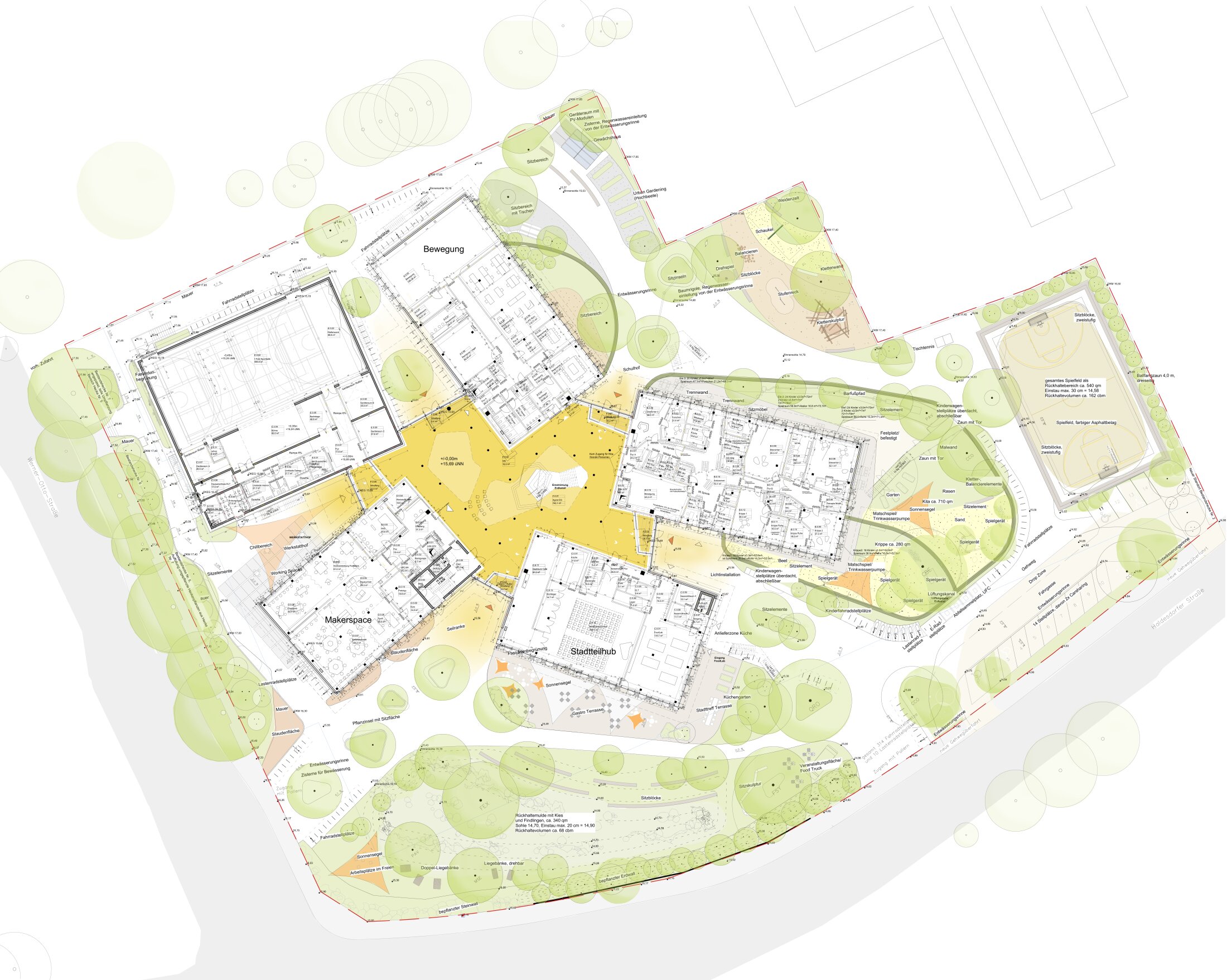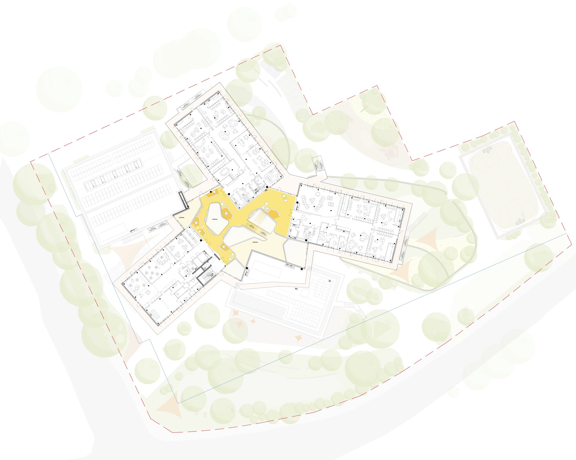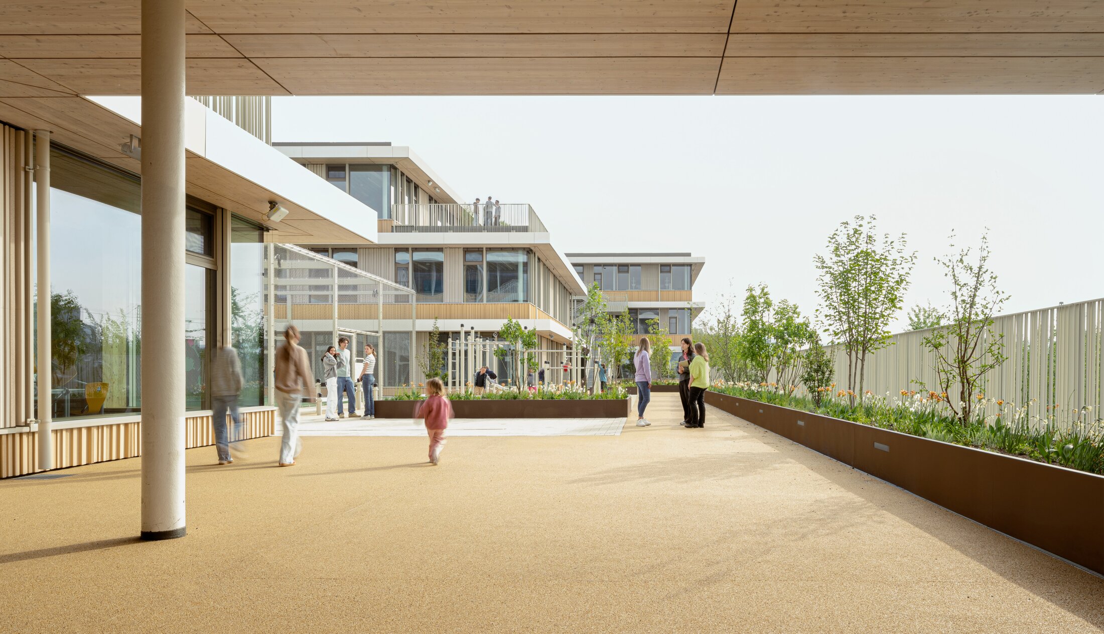 At the heart of the building, the central agora serves as a meeting place and venue for community events. Open to the surrounding landscape in summer, the agora is more enclosed during winter. It thus creates a flexible, climate-responsive space that connects all areas across three floors. A ramp ensures barrier-free access to all parts of the building. Designed for long-term adaptability, the sustainable structure can be easily adjusted to both seasonal changes and the evolving needs of its users. The upper floors feature adaptable spaces that extend onto broad terraces — places for relaxation, outdoor learning, and potential future expansion.