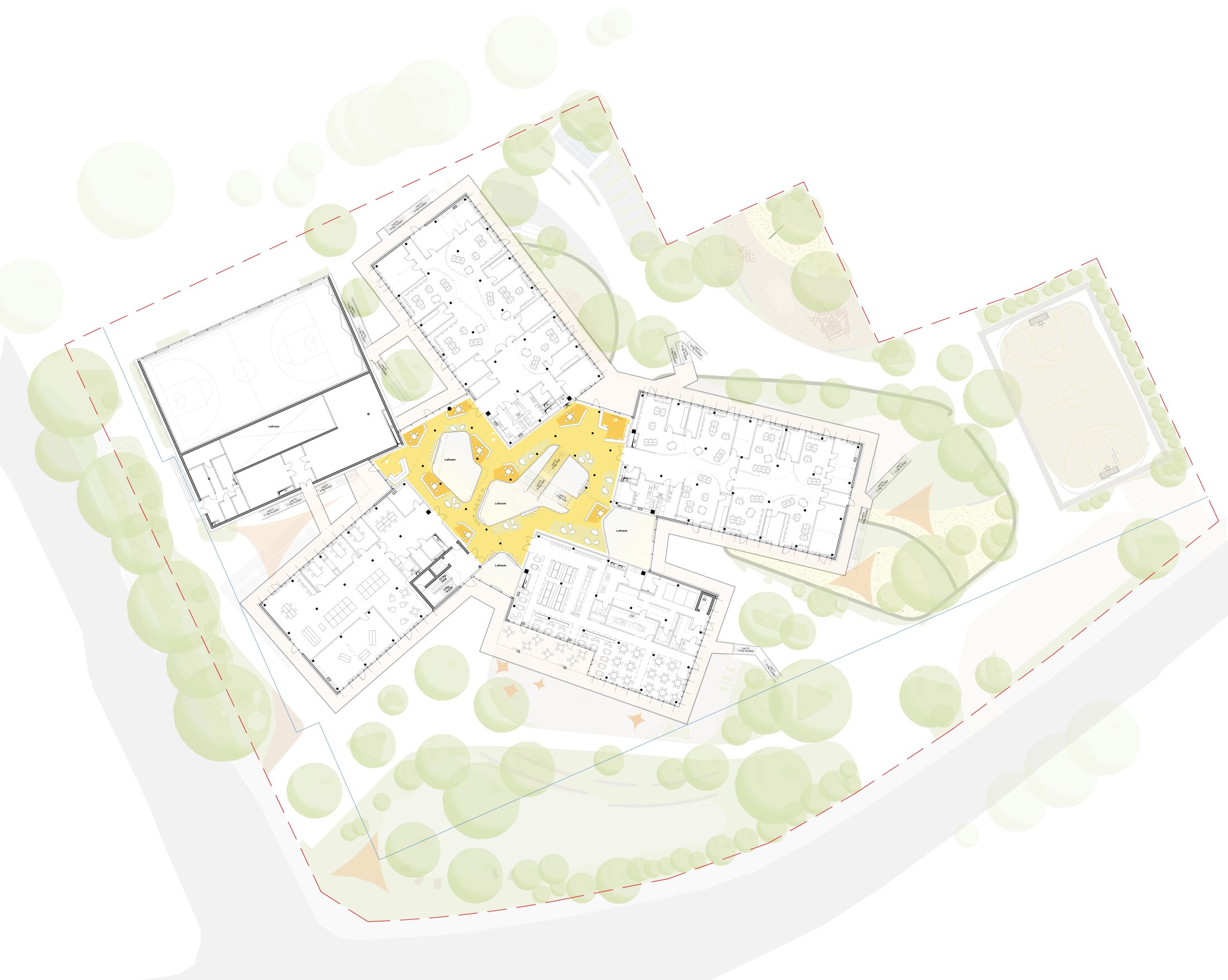 The inviting building fosters activity, interaction, and discovery, offering ample space for experimentation and exploration. It combines diverse programs under one roof: a daycare center, school, workshops and creative labs, a digital learning center, health and fitness facilities, urban gardening areas, and a café. A variety of outdoor spaces with appealing amenities complements the scheme, seamlessly blending indoor and outdoor spaces.