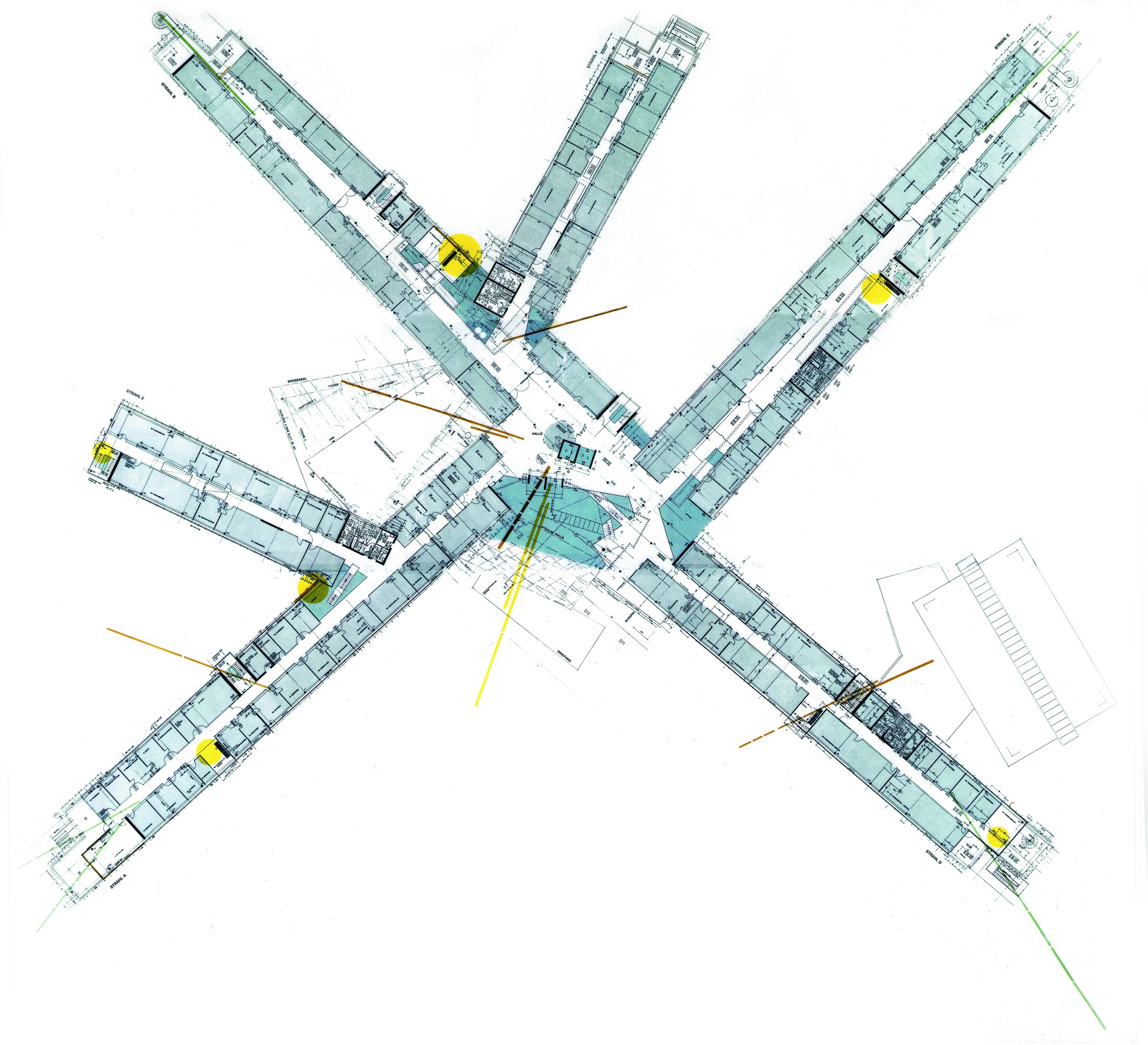 Organized in a pinwheel layout with staggered floors, the office building’s four main arms radiate from a central entrance hall along the site’s diagonals, with two of the arms featuring subordinate volumes. Their slender form ensures natural lighting and ventilation for all workspaces as it provides optimal visual connections to the surroundings.