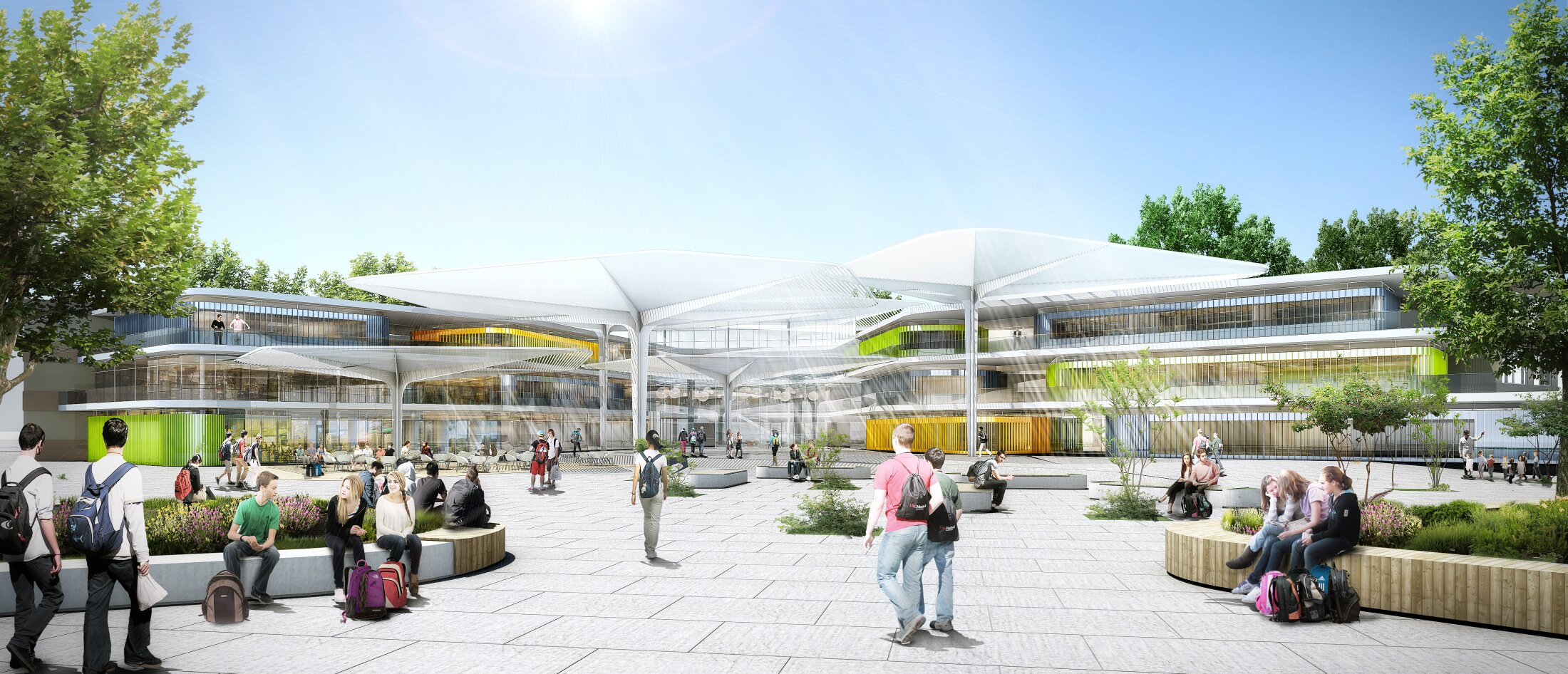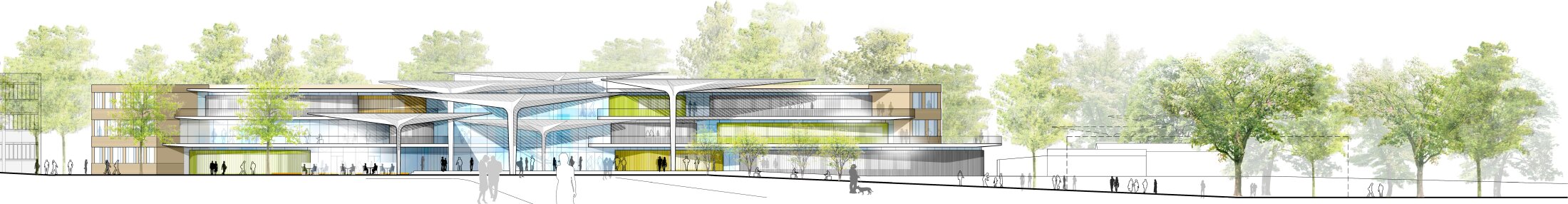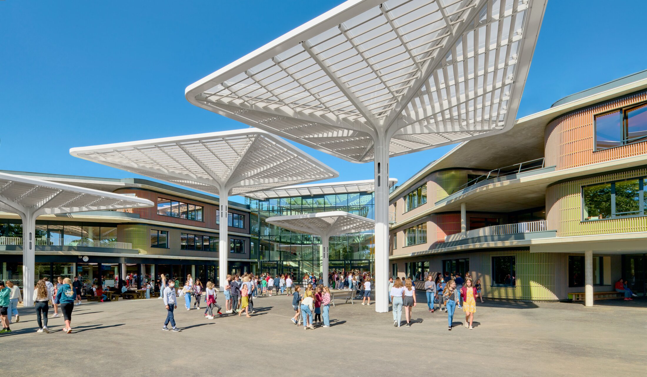 Oriented towards the adjacent park, the buildings open learning spaces to nature, creating strong visual and spatial links to greenery. A transparent entrance facade towards the street forms a clear and inviting arrival, leading into a central atrium that connects all functions. Towards the park, the architecture becomes more fluid and landscape-oriented, offering diverse views and enhancing the relationship between interior and exterior. A large canopy structure links courtyard and atrium, forming the social and cultural heart of the campus.