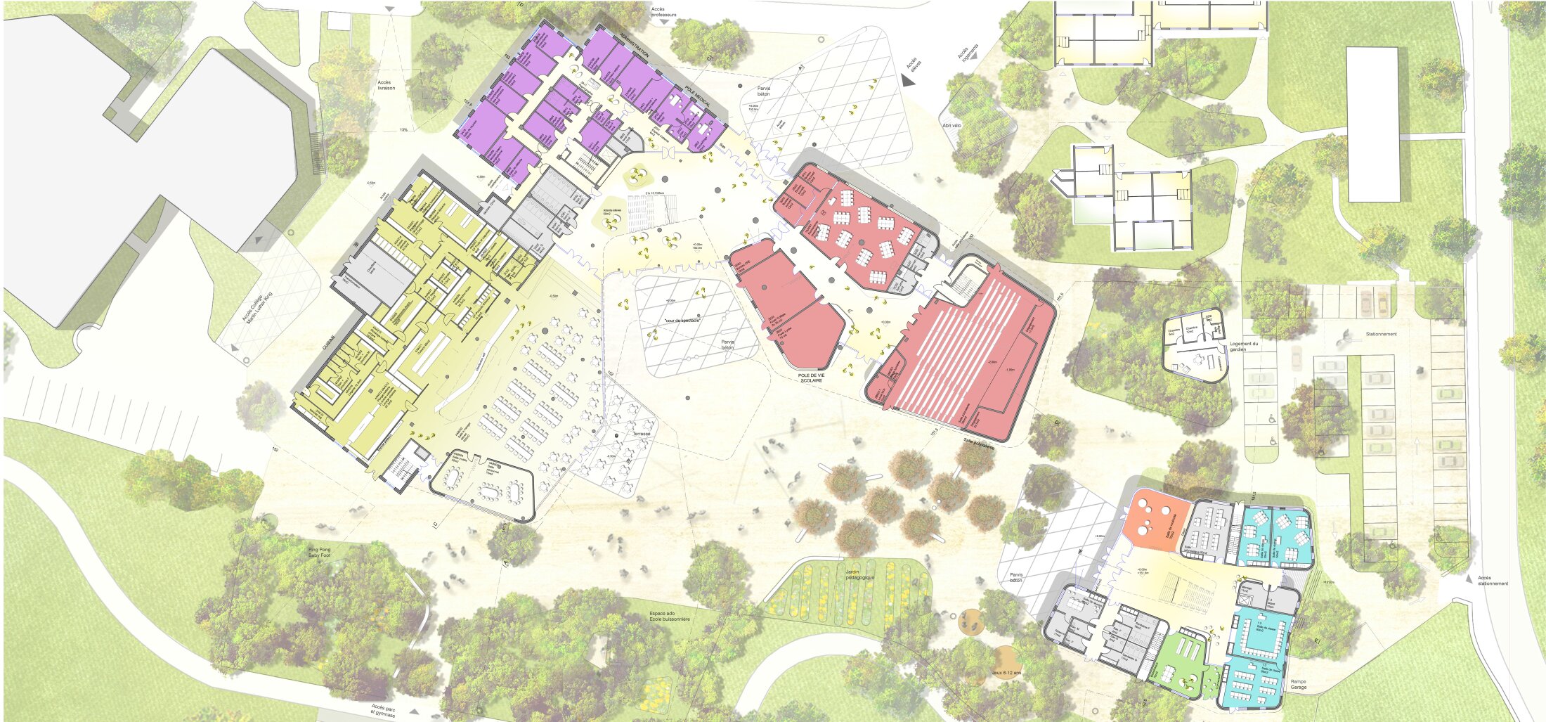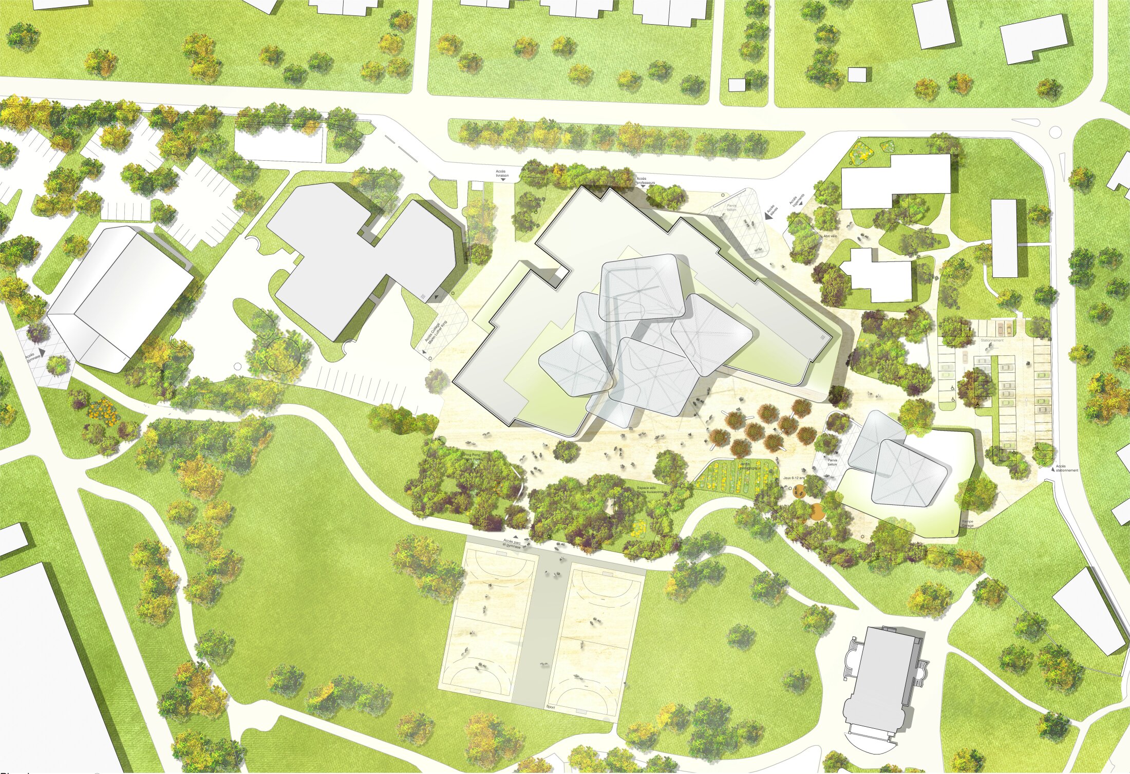 The project restructures and extends the existing lycée, adding a new primary school and integrating the sports hall into a unified ensemble. Retaining the structural framework of the existing buildings, the design introduces new volumes that follow soft, horizontal lines and connect harmoniously with the surrounding landscape. Oriented towards the adjacent park, the buildings open learning spaces to nature, creating strong visual and spatial links to greenery.