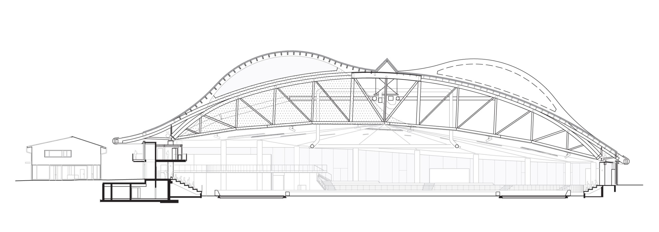 The energy concept also includes sustainable features such as wood pellets with a neutral energy balance and reuses waste heat from the ice cooling system to warm the grandstands. This integration of natural light—pioneering in ice stadium design at the time of construction—along with a strong connection to the surrounding landscape, enhances both the structure’s sustainability and the well-being of its athletes.