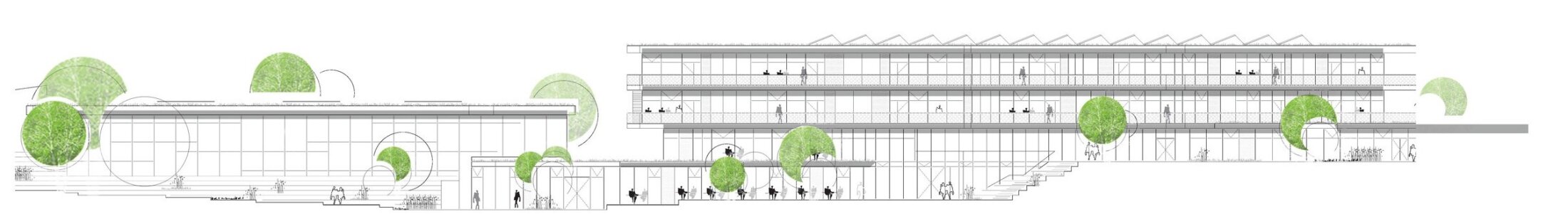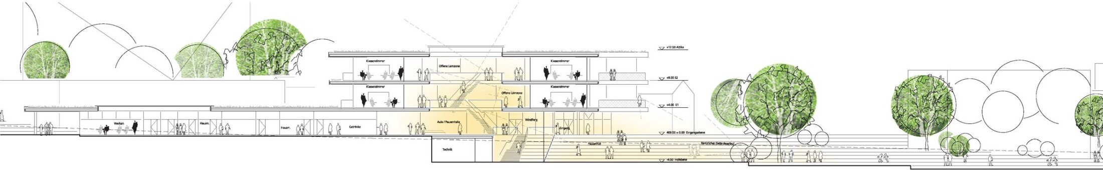 The project replaces the existing school with a new middle school complex including a triple sports hall, outdoor facilities, and spaces for local music groups. In response to the heterogeneous suburban context, the design avoids a monolithic structure and instead proposes a composition of smaller, interconnected volumes integrated into the landscape. The campus is developed in phases, ensuring uninterrupted operation during construction. Sports functions are concentrated in the south, while a shared central schoolyard links the new middle school with the existing high school within a largely car-free environment. Access from the north leads to a central atrium that forms the social and spatial heart, connecting all key functions. The natural slope is used to create a layered sequence of spaces, linking entrance, courtyard, cafeteria, and sports areas.