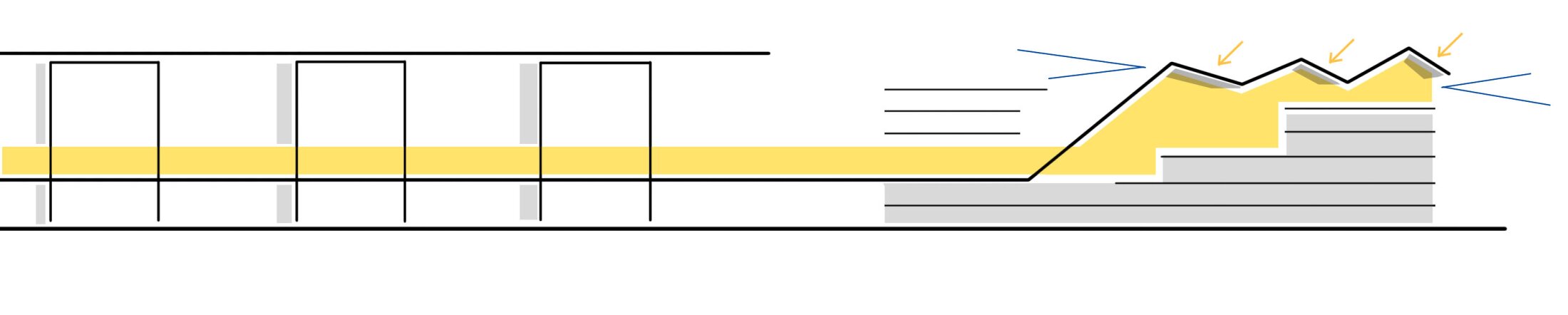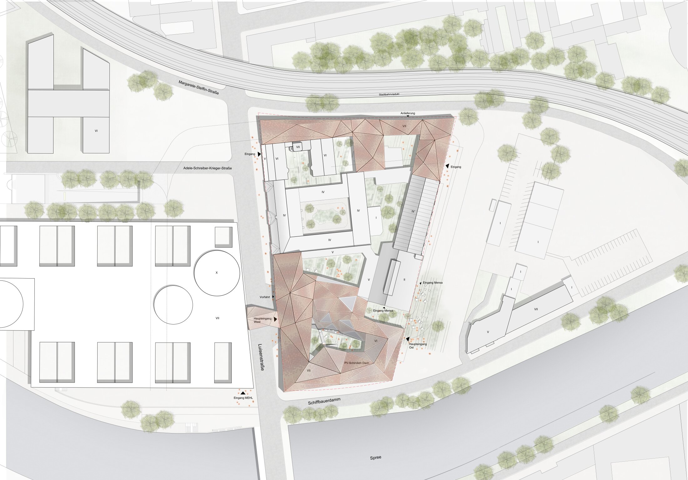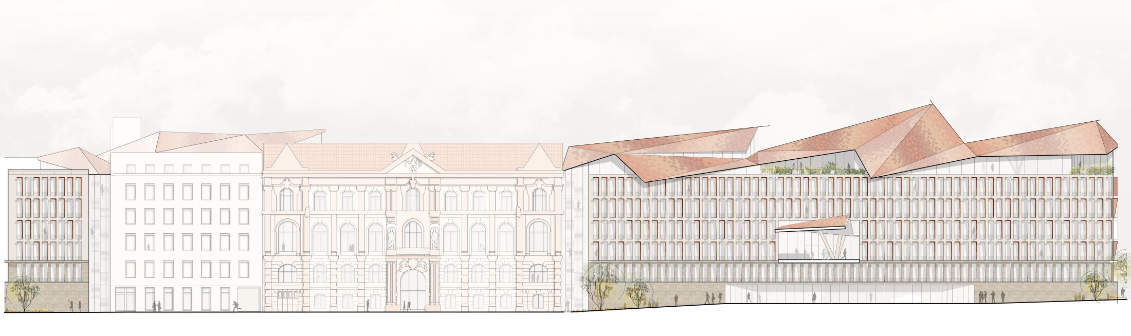 Rather than continuing the Band purely as a formal gesture, the project extends its internal organizational principle: a dominant circulation and communication spine connecting the parliamentary buildings. Movement and encounter spaces are continued as a programmatic and conceptual extension rather than as a rigid urban axis. Urbanistically, the project adopts the Berlin block typology with a staggered system of inner courtyards, carefully integrating the historic buildings into a coherent ensemble without overpowering them. A freely formed roof structure spanning the new northern and southern building wings mediates between the historic fabric and the new architecture, completing the closed block.