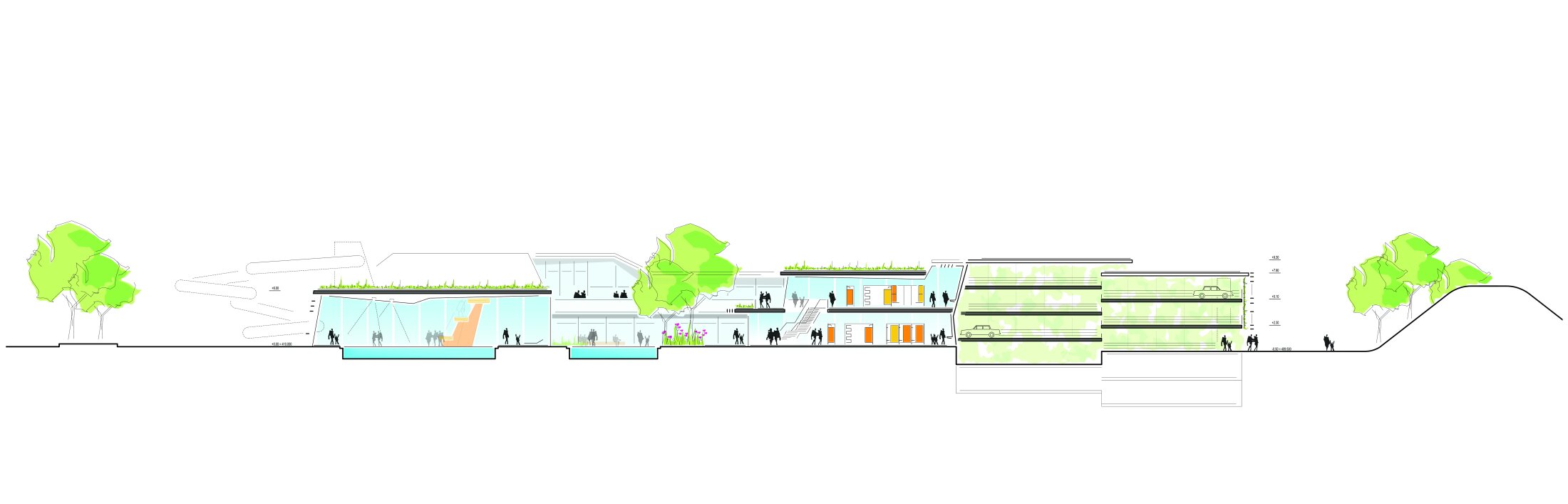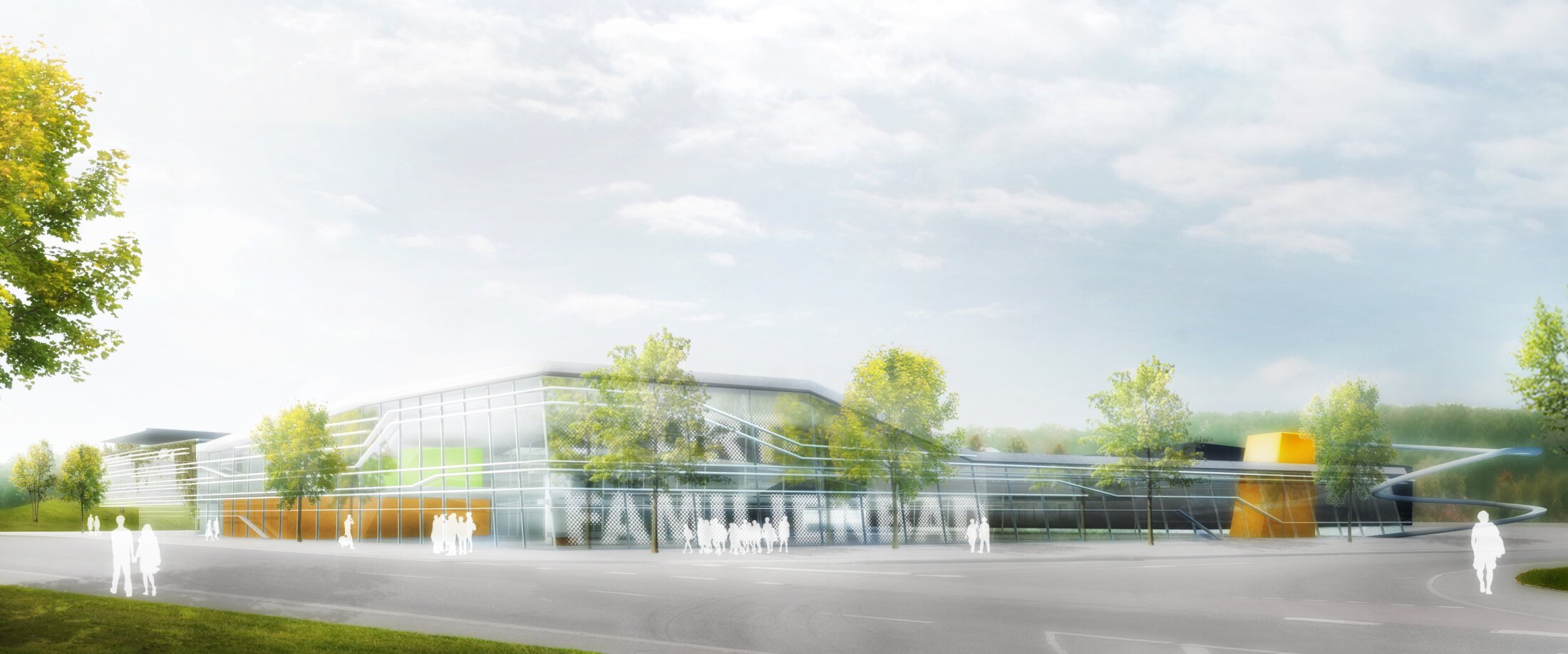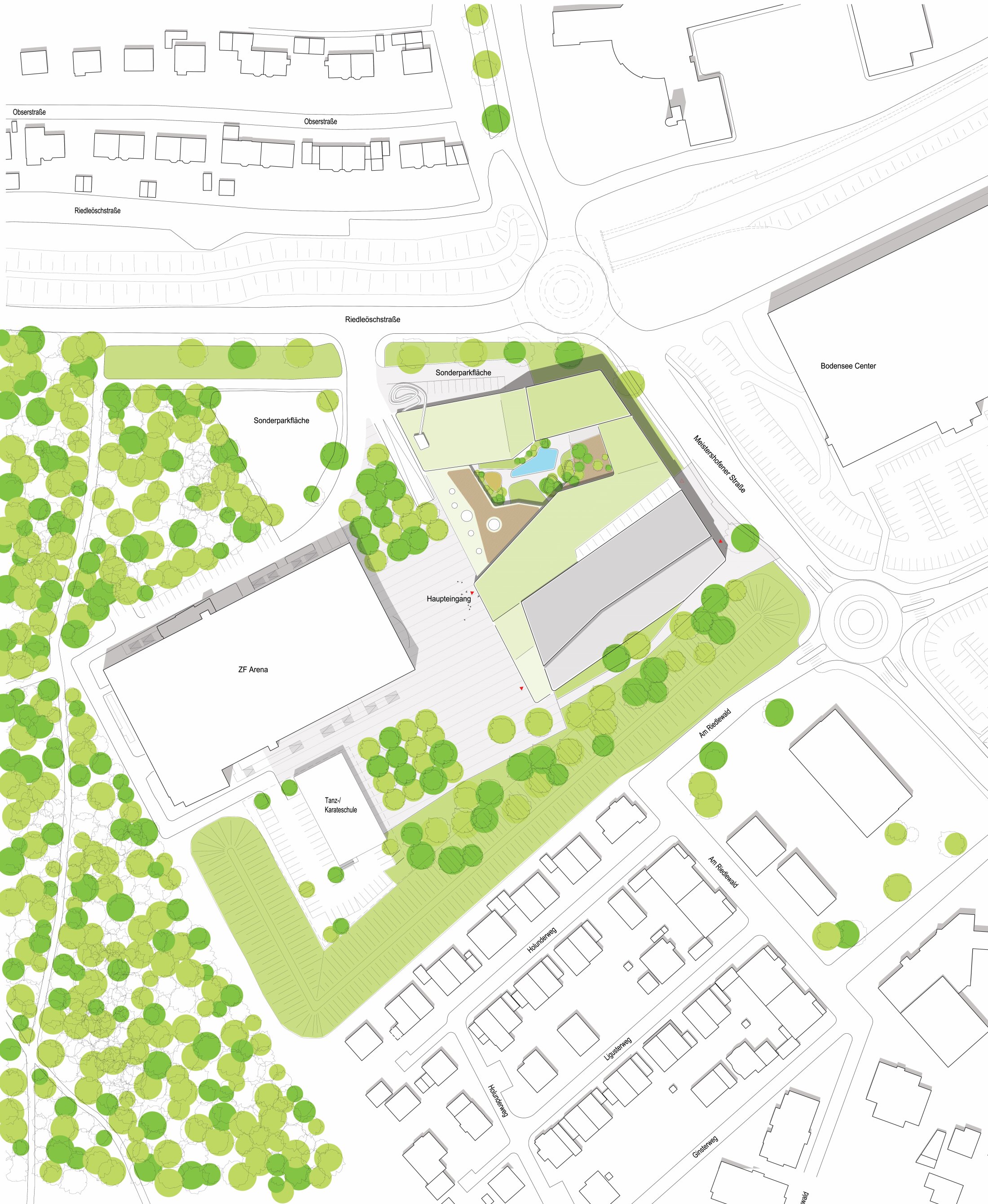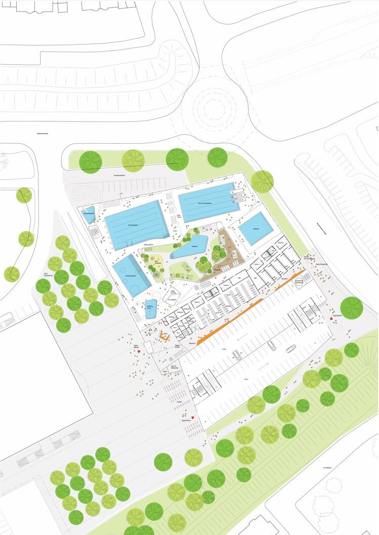 Replacing the outdated existing facility, the new indoor pool is designed as a modern sports and leisure destination for residents, schools, and clubs. Rather than focusing on spectacular attractions, the concept emphasizes a high-quality, versatile environment with multiple pools, family areas, diving facilities, and an extensive sauna landscape. Outdoor relaxation areas, including a sauna garden and thermal pools, enhance the overall experience. The heterogeneous surrounding defined by the ZF Arena, commercial buildings, and infrastructure require a clear and confident architectural response. The building is positioned to form an attractive forecourt shared with the arena, establishing a strong public entrance while keeping the area largely free of traffic. Entrances to both the pool and the parking garage are carefully placed to ensure accessibility and functional clarity.