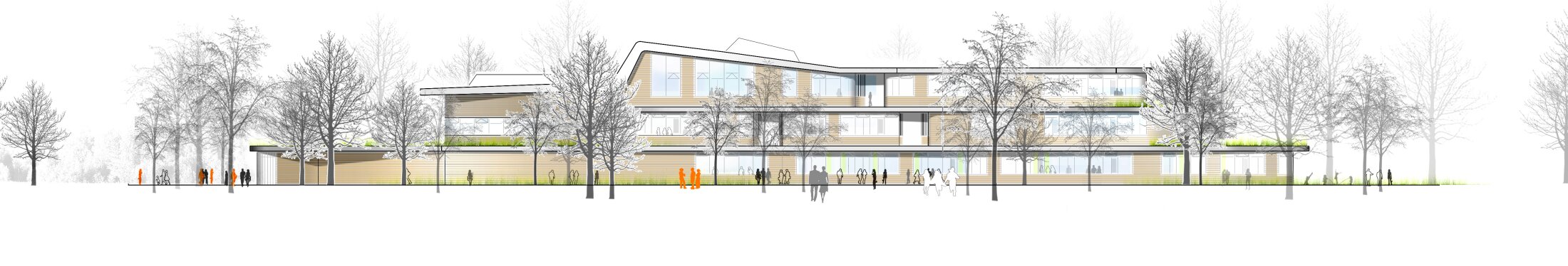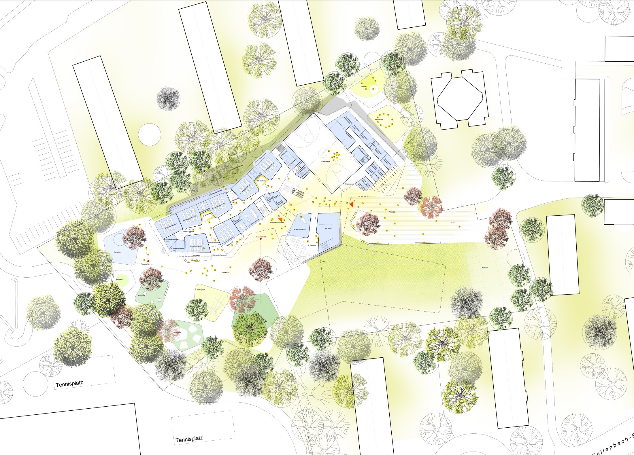 The schoolyard is designed as a landscaped environment with diverse play and learning areas, linking the school to neighboring educational facilities. Natural materials and a timber-based facade reinforce the architectural concept.