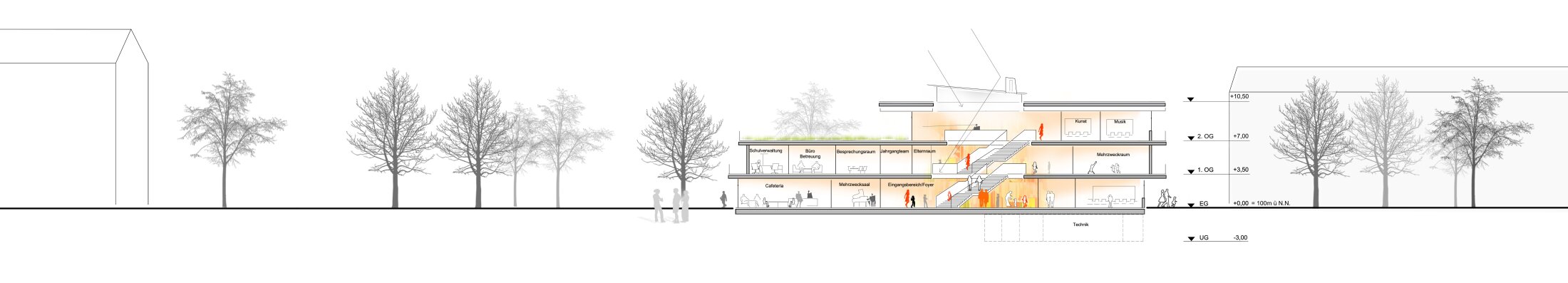 Replacing outdated existing buildings, the new school establishes a modern and flexible framework for primary education. Its terraced structure integrates into the surrounding neighborhood while expressing a distinct architectural identity. The spatial concept supports contemporary pedagogy through open, interconnected learning environments. Circulation areas merge with teaching spaces, and outdoor areas are incorporated as “green classrooms” and retreat spaces, especially for younger students.