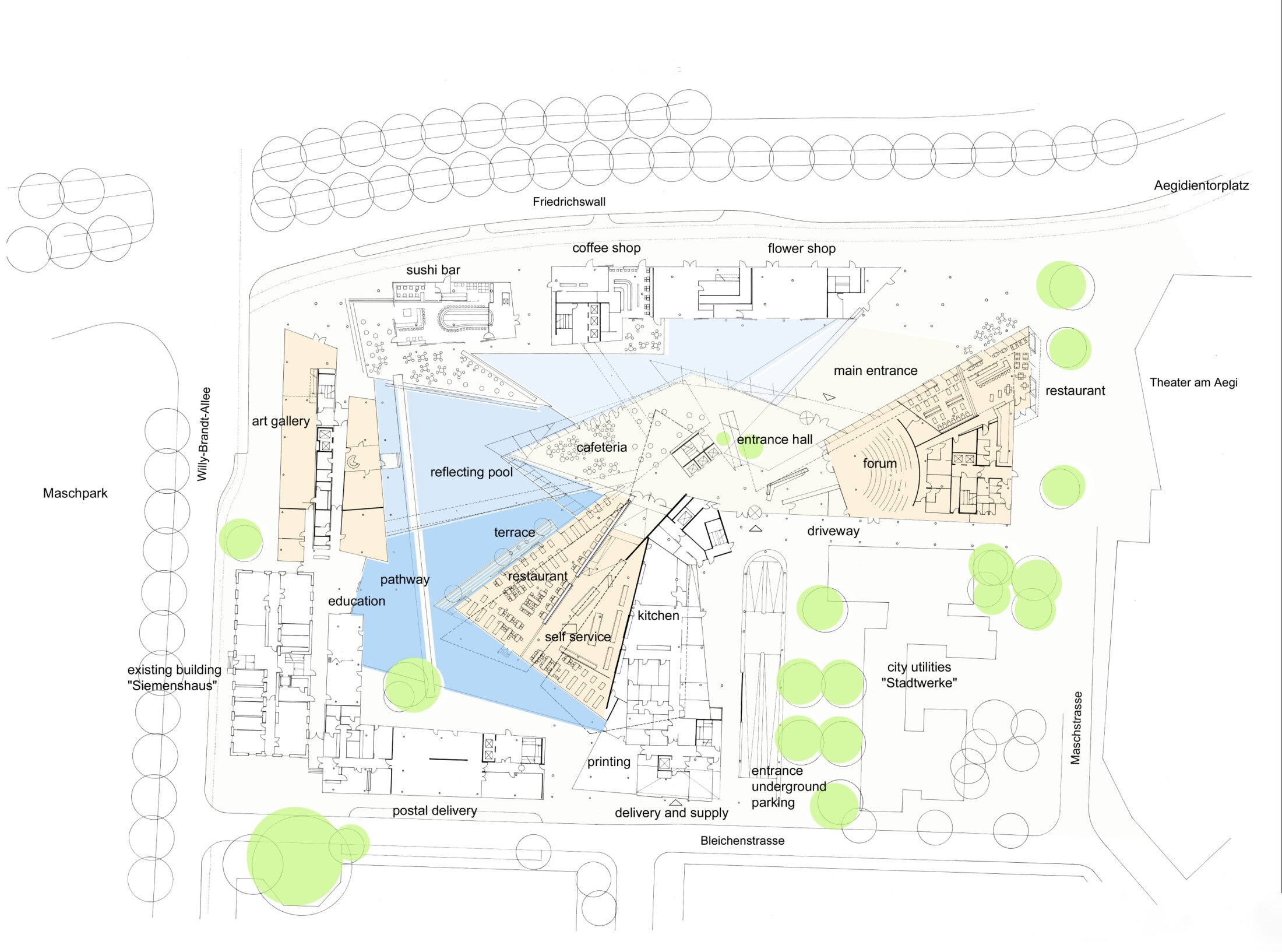 Occupying a full city block between the city center and residential areas, the Norddeutsche Landesbank serves as a key link between diverse urban districts—retail, residential, commercial, cultural, and recreational. Its varied heights allow the building to blend gently into the existing urban fabric. In line with planning guidelines, the 4- to 6-story shallow-plan perimeter structure aligns with the surrounding streets, reinforcing the city’s scale and responding to two existing buildings. From the outside, it recalls the traditional city block, while at its center lies a large, publicly accessible courtyard—shielded from traffic noise and serving as the heart of the complex. This courtyard, animated by the bank’s daily operations, is further activated by shops, cafés, restaurants, reflecting pools, lush landscaping, and public art.