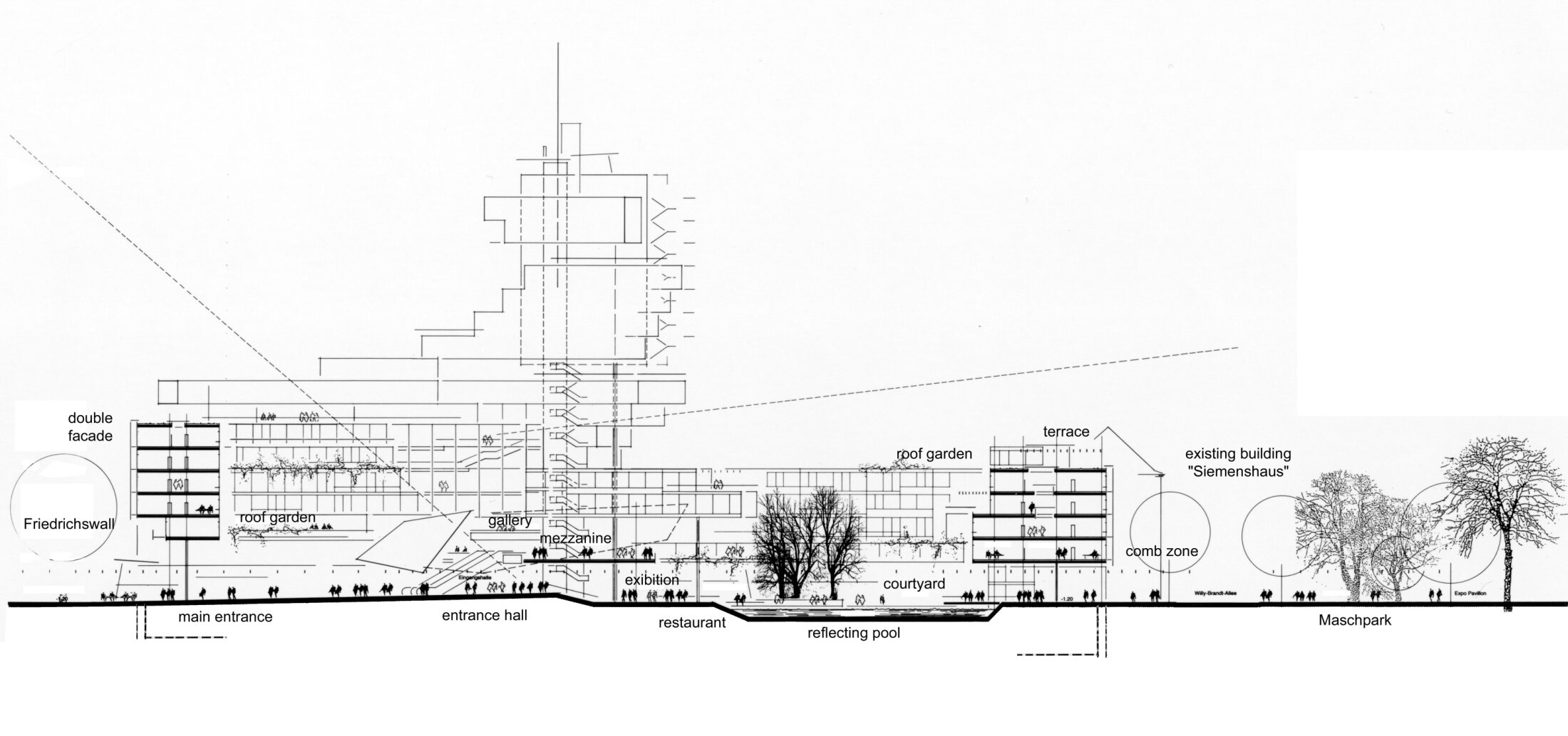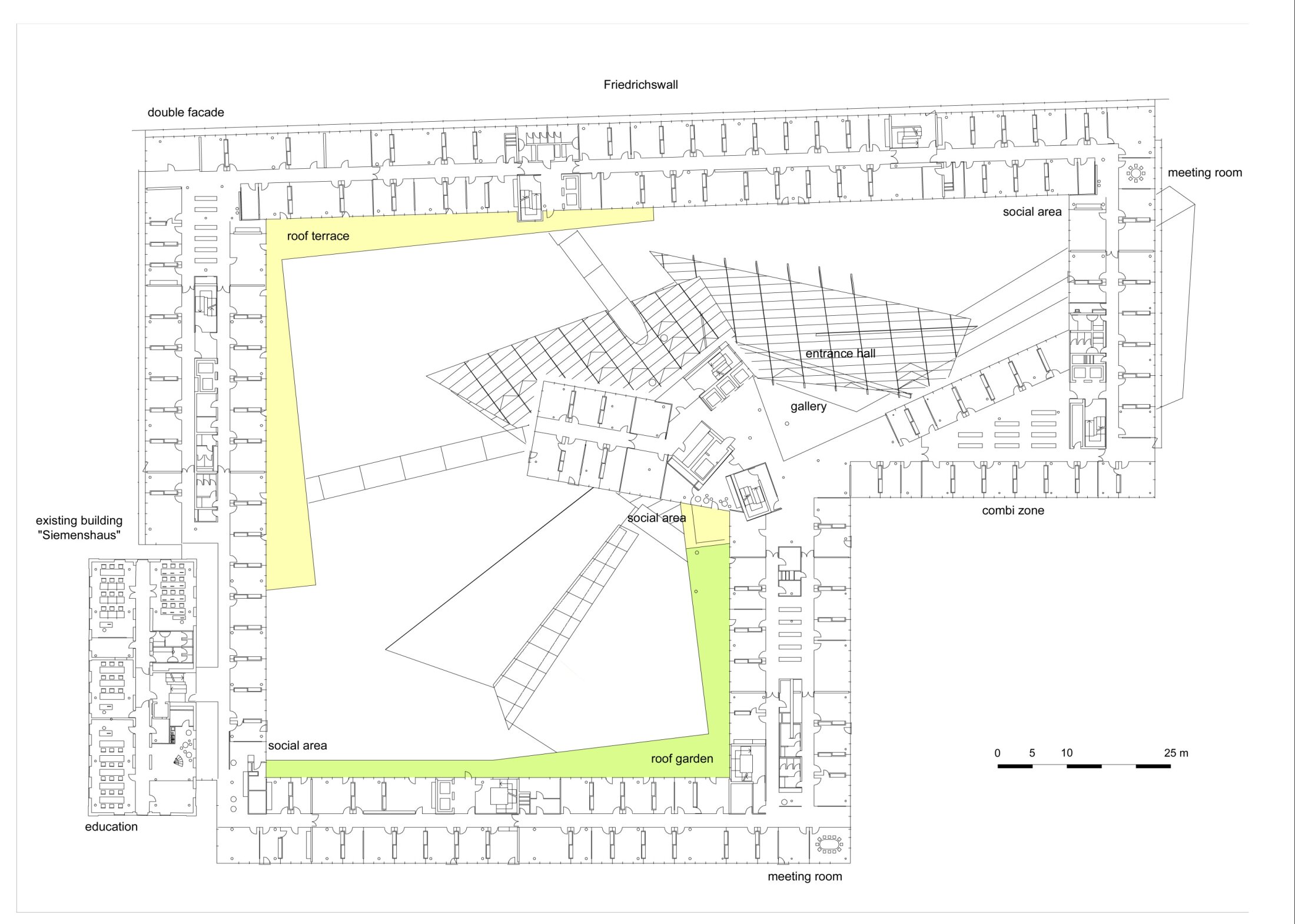 Rising from this central space is a distinctive 70-meter tower, which departs from the formal order of the perimeter building through a series of twists and shifts. Its expressive form establishes visual and symbolic connections to the broader city and references the geometries of the historic northern downtown rather than the surrounding post-war grid. This high-rise building features conference areas, lounges, restaurants and board offices.