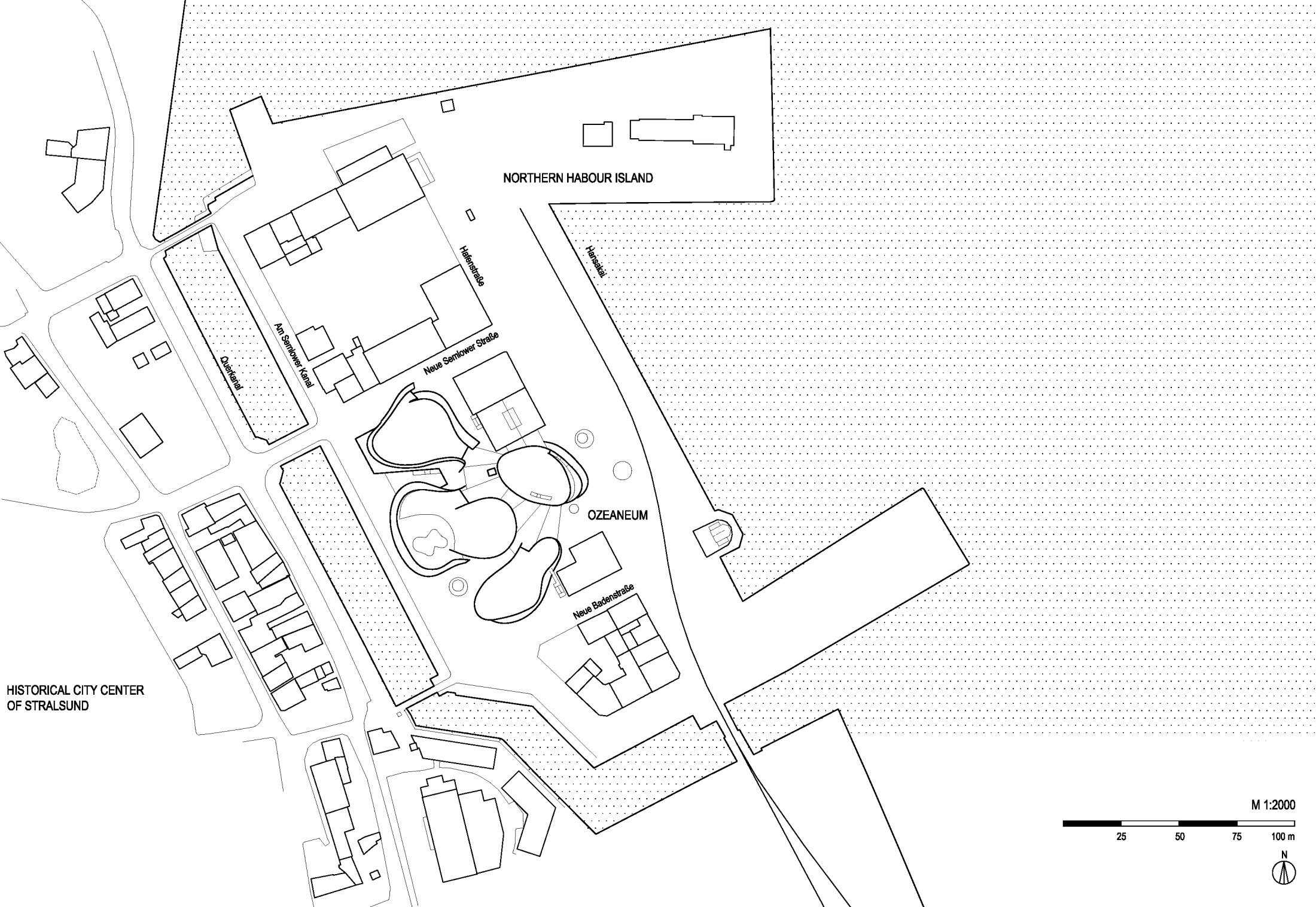 The OZEANEUM relates to the sea, rather than to the city. It is conceived as an open house, designed to be flooded with daylight and accessible to visitors from all sides. Reminiscent of stones around which water swirls, the building is divided into four individual sections, each of which is devoted to a particular exhibition theme including two aquaria addressing the North Sea and the Baltic Sea. This layout allows visitors to take a spectacular journey of discovery through and between the exhibitions. The centerpiece of the North Sea aquarium is a huge tank of schooling fish.