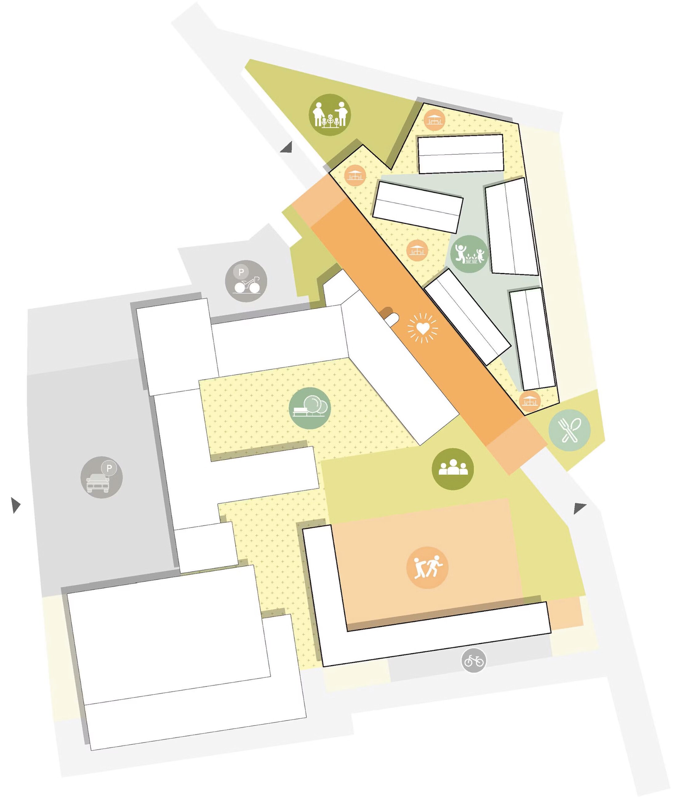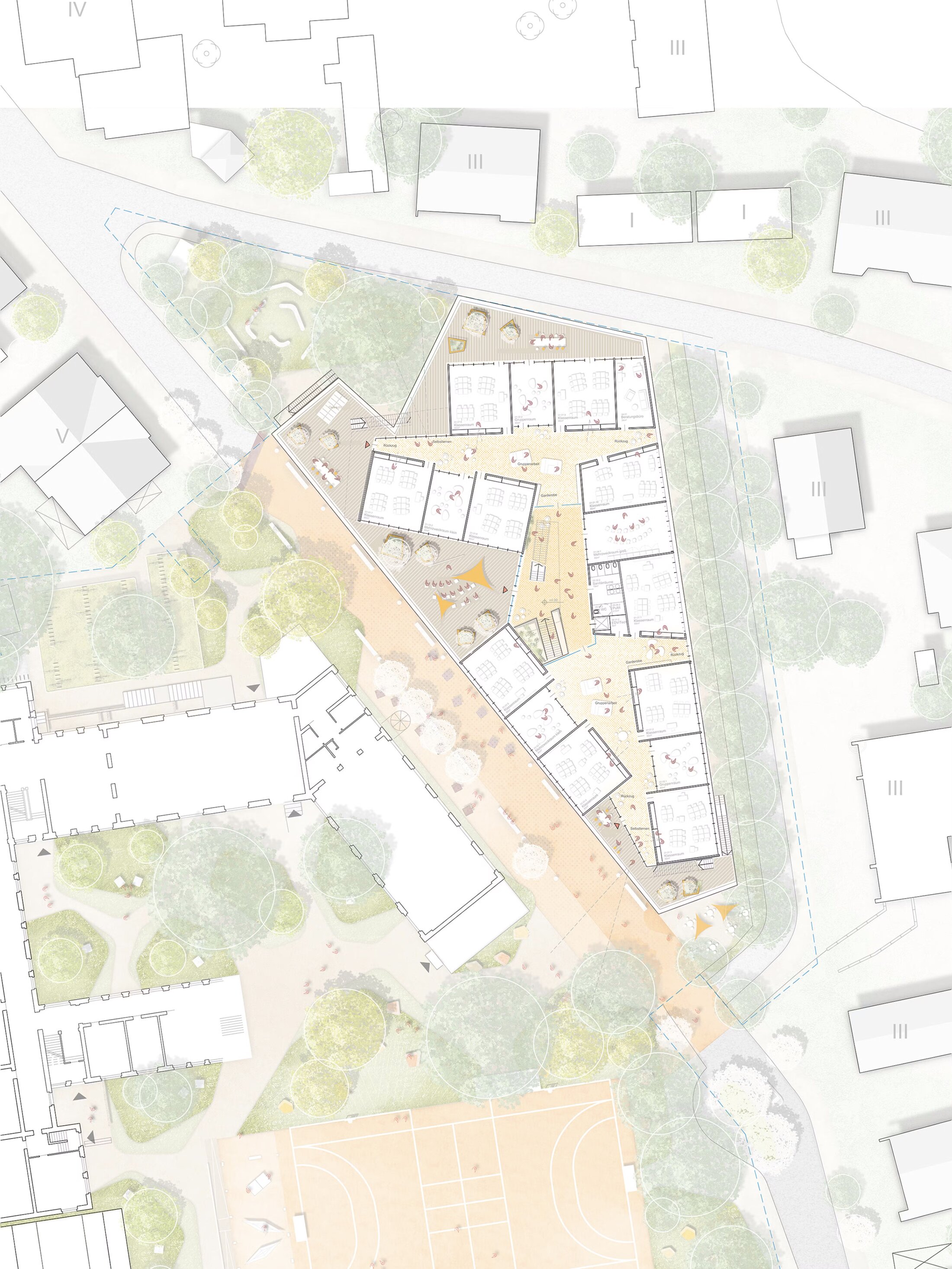 The design responds sensitively to the heterogeneous context between the historic school building and the surrounding residential fabric. Instead of a dominant volume, the new building is conceived as a series of small-scale, two-storey pavilion-like structures resting on a unifying plinth, referencing the former nursery use of the site. The plinth extends the outdoor space into the building and structures the schoolyard into a sequence of differentiated courtyards while preserving the majority of existing mature trees. A generous, covered incision marks the main entrance and establishes a new boulevard as the central connection between old and new buildings. Internally, the foyer functions as a central marketplace and orientation space with flexible multi-use potential. Shared functions such as the cafeteria and science departments are located on the ground floor for campus-wide accessibility. Learning is organized in clearly defined year-group clusters across two storeys, offering a variety of spatial situations for classroom teaching, collaborative learning, retreat, and outdoor education. The spatial concept supports flexibility, interaction, and the pedagogical profile of the school as a UNESCO Cultural School.