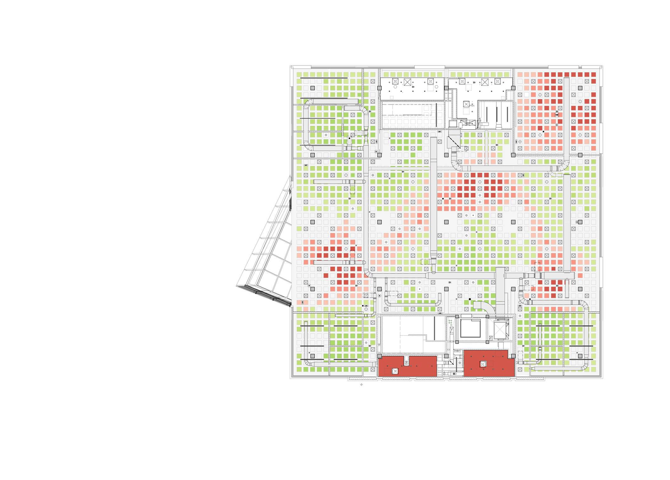 The stacks are located towards the interior zone of the floor, between the cores, to mitigate any impact of sunlight on the printed material. This also preserves perimeter floor space for more regularly occupied functions that are able to take advantage of the daylighting as well as the natural ventilation afforded by the new upgraded facade. Positioned deep within the plan, away from the facade, the glazed interior partitions maximize visual transparency and transmission of daylight. Within the waffle slabs, colored acoustic panels generate a gradient, pixelated composition that emerges from the cores, animating the ceiling as one walks across the space.