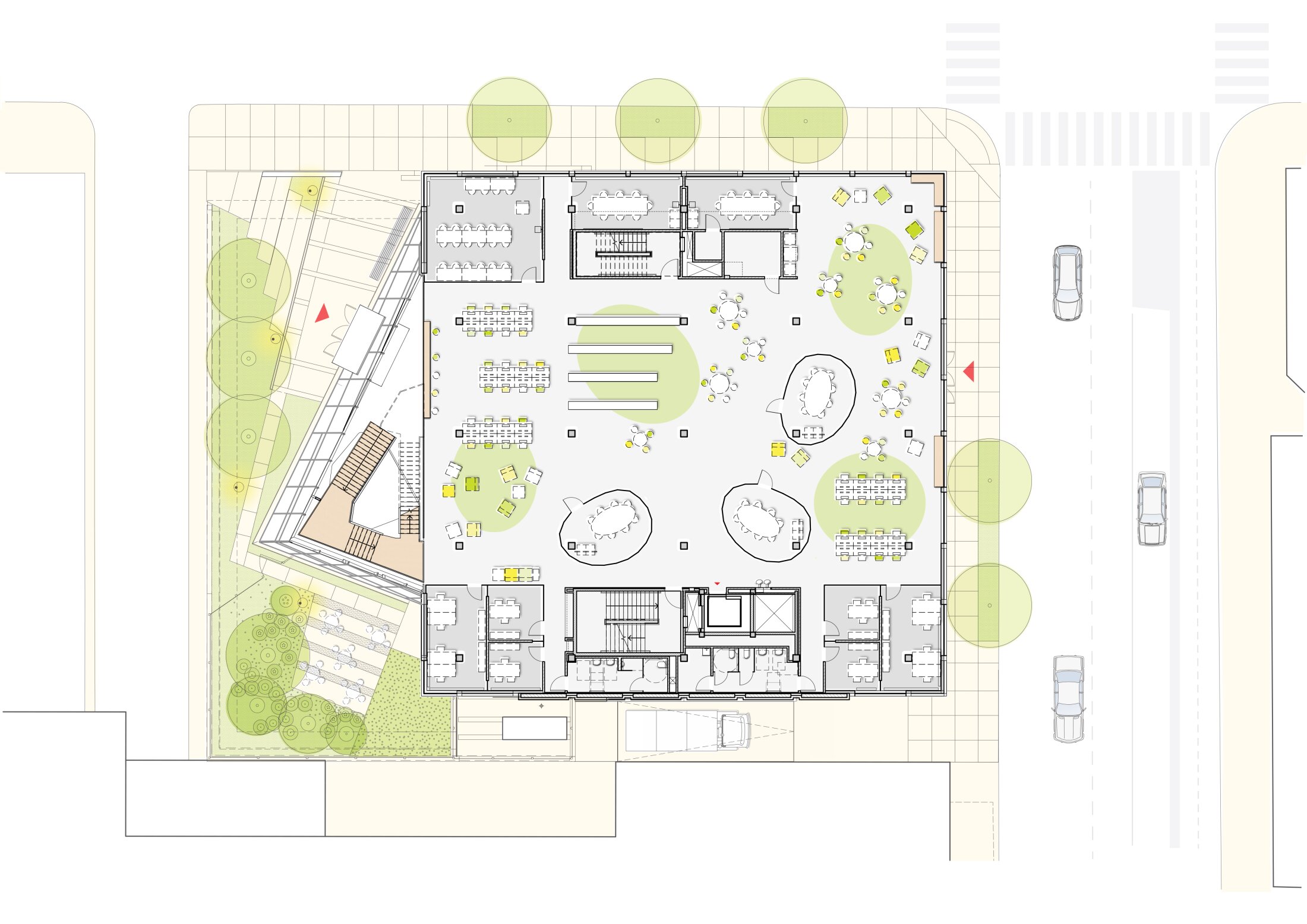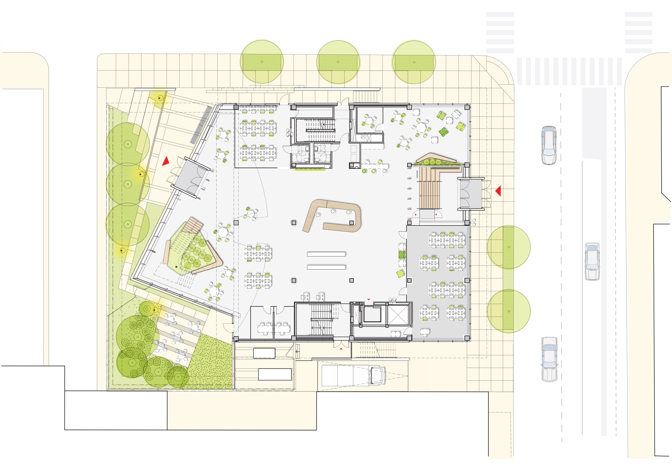 The 1960s library retained its original massing, which can be described as a floating box. Our spatial interventions sought to bring daylight into the building while enhancing vertical communication. A newly added glass hall on the west side forms an academic and public space that complements the original structure, its geometry distinguishing the addition while preserving the elemental simplicity of the original cube. The west atrium establishes a prominent urban presence along the adjacent street, signaling a renewed life for the building.