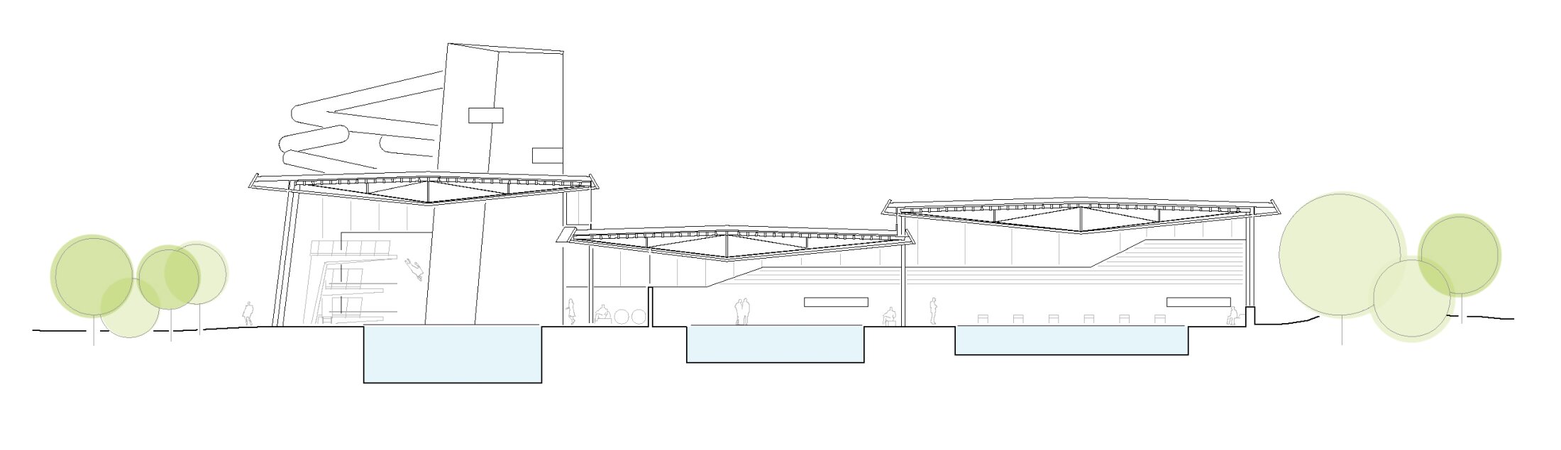 This vibrant aquatic landscape features two 25-meter swimming pools, a non-swimmer’s pool with a slide, a toddler pool, a warm-water pool, a learning pool with a movable floor, diving facilities, two giant slides, and a water playground. Varying ceiling heights accommodate the specific needs of each area while creating a dynamic spatial composition that balances a sense of security with expansive open spaces encouraging visitor interaction. The harmonious arrangement of three distinct roofs gives the building an inviting, sculptural character.