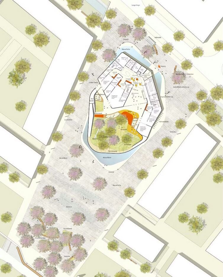 The terrace stretches between promenade and Langer Anger as an elegant, multifunctional “urban salon.” A continuous natural stone surface, ornamental cherry trees, and water features define its character, while subtle separations mediate between public space and adjacent residential areas. Integrated delivery access and lighting elements ensure functionality without compromising spatial quality. At its center, the daycare appears as a sculptural solitaire, surrounded by water and framed by seating edges, while tree-lined edges connect the square to the wider urban context.