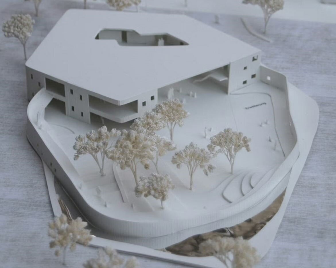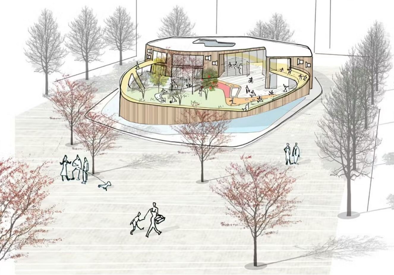 The daycare building is conceived as a compact, fortress-like volume, emphasizing its public role. Inside, a light-filled central space with double-height areas forms the communal heart, connecting dining, activity, and group areas across two levels. All group rooms are oriented south toward the garden, enabling direct indoor-outdoor interaction while maintaining clearly defined private zones. Flexible layouts and adaptable partitions support changing needs and diverse educational uses.
