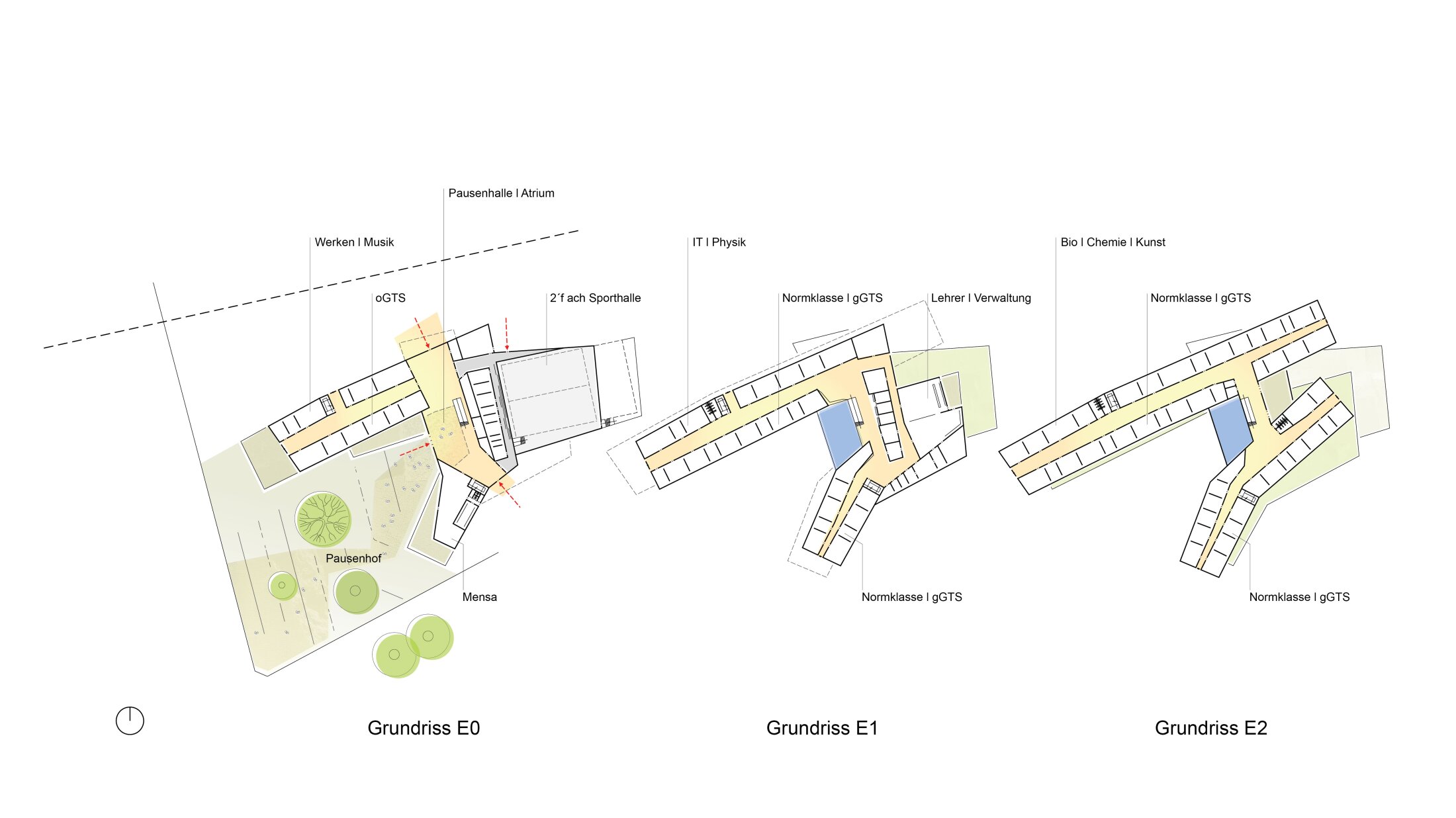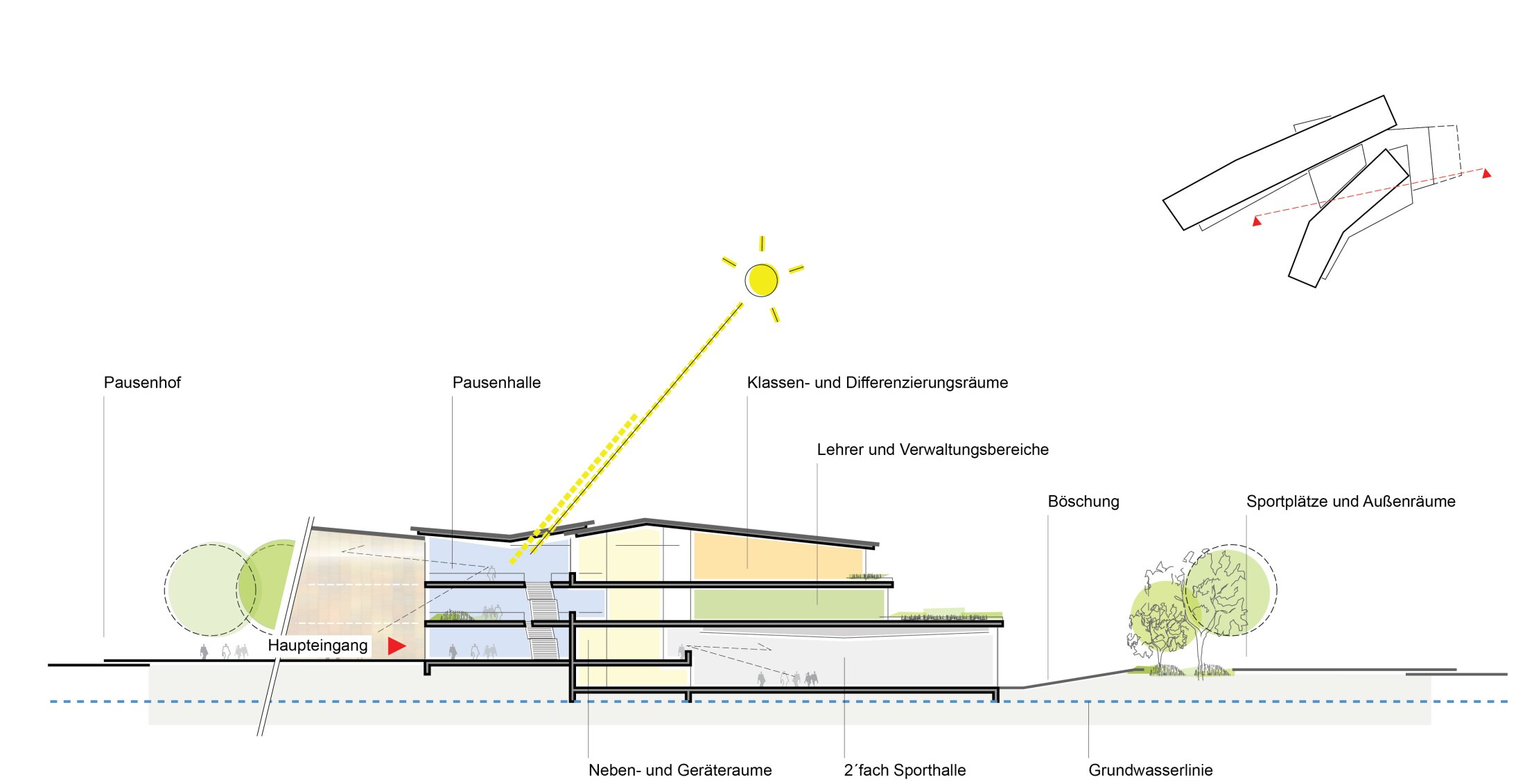 The building is organized around a central, light-filled assembly hall that forms the social and spatial heart of the school. Entered from a car-free forecourt, it provides clear orientation and connects all key functions, with administration and staff areas located on the ground floor. Teaching spaces are arranged around this core, creating open galleries, flexible learning areas, and group rooms. Circulation zones act as extensions of the classrooms, supporting interaction and contemporary learning formats.