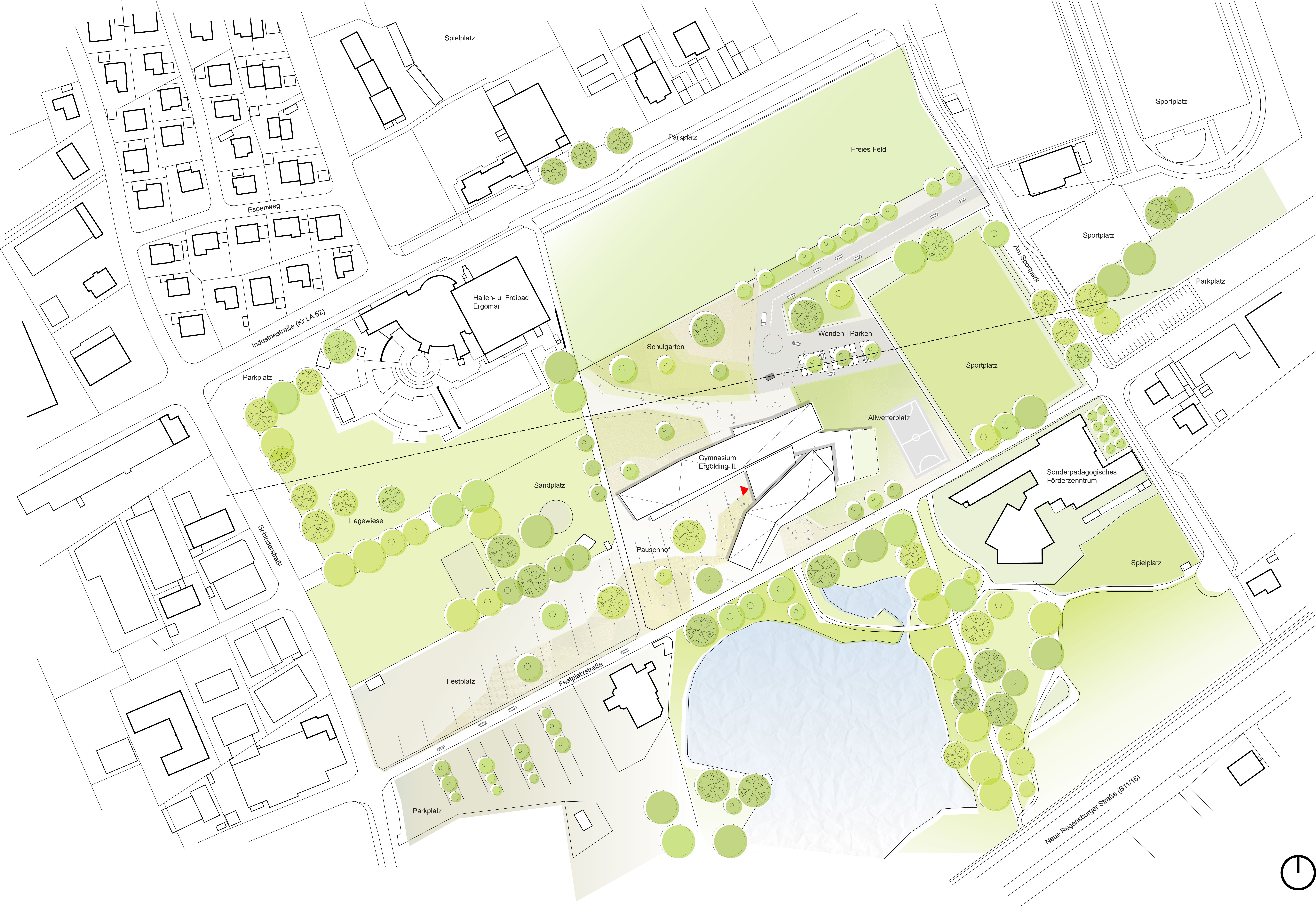 The new secondary school in Ergolding is conceived as a compact and open campus that connects learning, community, and landscape. It creates a clear architectural identity while responding to its location at the edge of the town.
