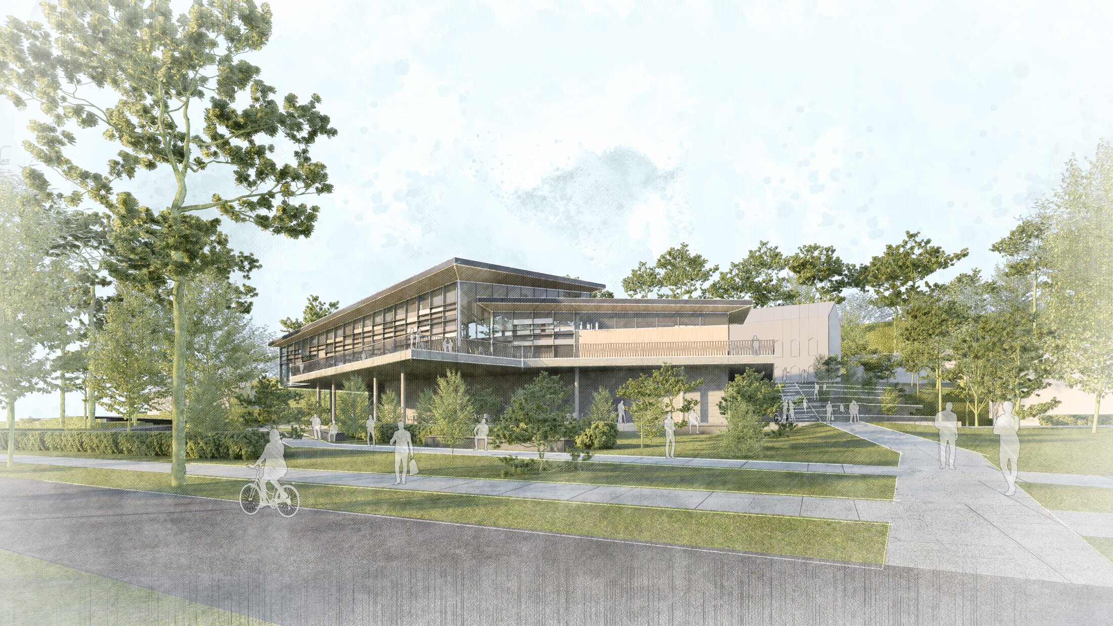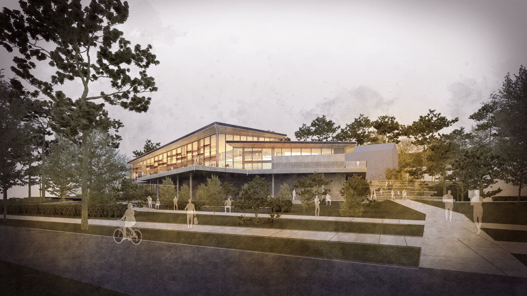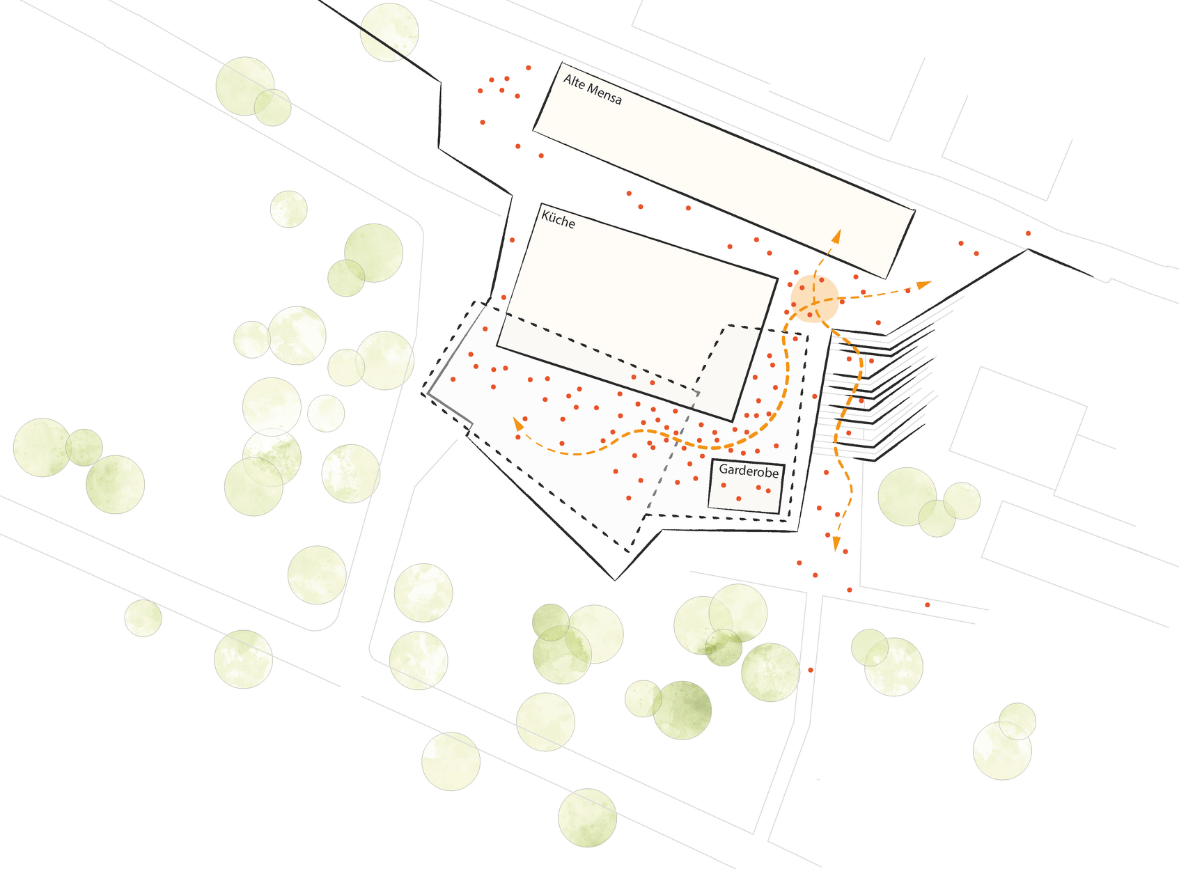 The three-part building, with each section rising to a different height, makes skillful use of the sloping site to create two levels, each of which can be accessed from ground level. The free forms of the foyer and canteen on the upper level are arranged around the kitchen facilities located further up the slope, while the service areas on the lower level are embedded within the topography. The building’s edges guide visitors toward the entrances and give rise to new outdoor areas.