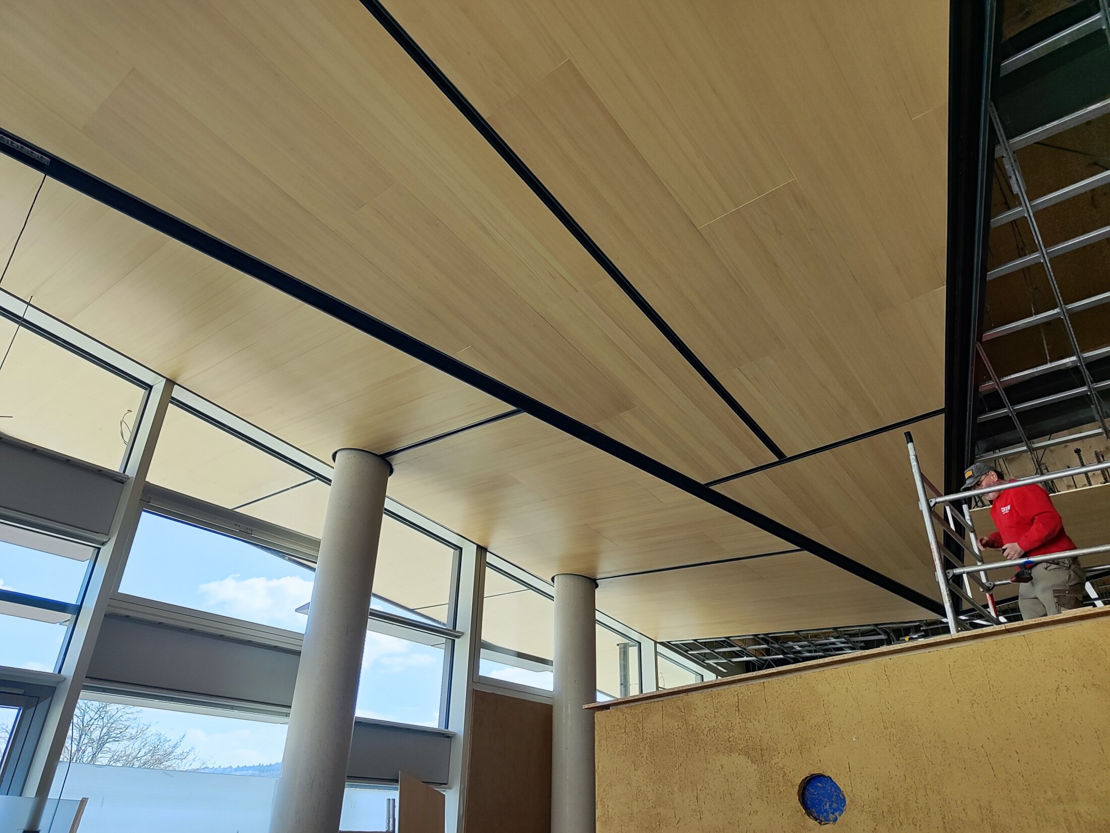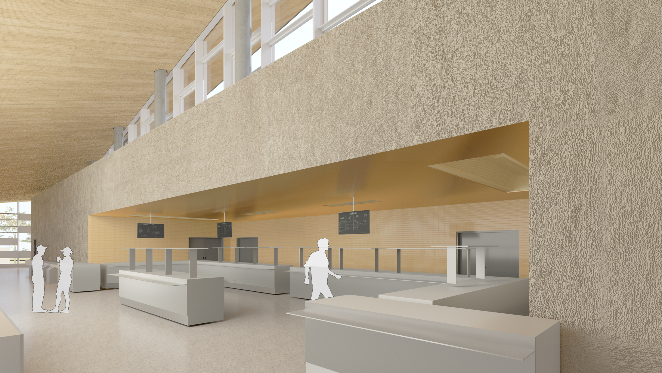 Bands of light separate the ceilings of the foyer and canteen from the kitchen, enhancing the impression that they float while allowing ample daylight to penetrate the space, even from the north. The canteen’s cantilevered terrace reinforces the building’s horizontal composition, extending from the courtyard to wrap around the dining area like a contour line. Parts of the lower level beneath are integrated into the slope, visually linking with the landscaped outdoor stair and accommodating the delivery area, storerooms, changing rooms, as well as the technical building services. The arrangement ensures a separation of user flows, thereby establishing the ideal conditions for implementing food safety protocols necessary for operating a large-scale kitchen.
