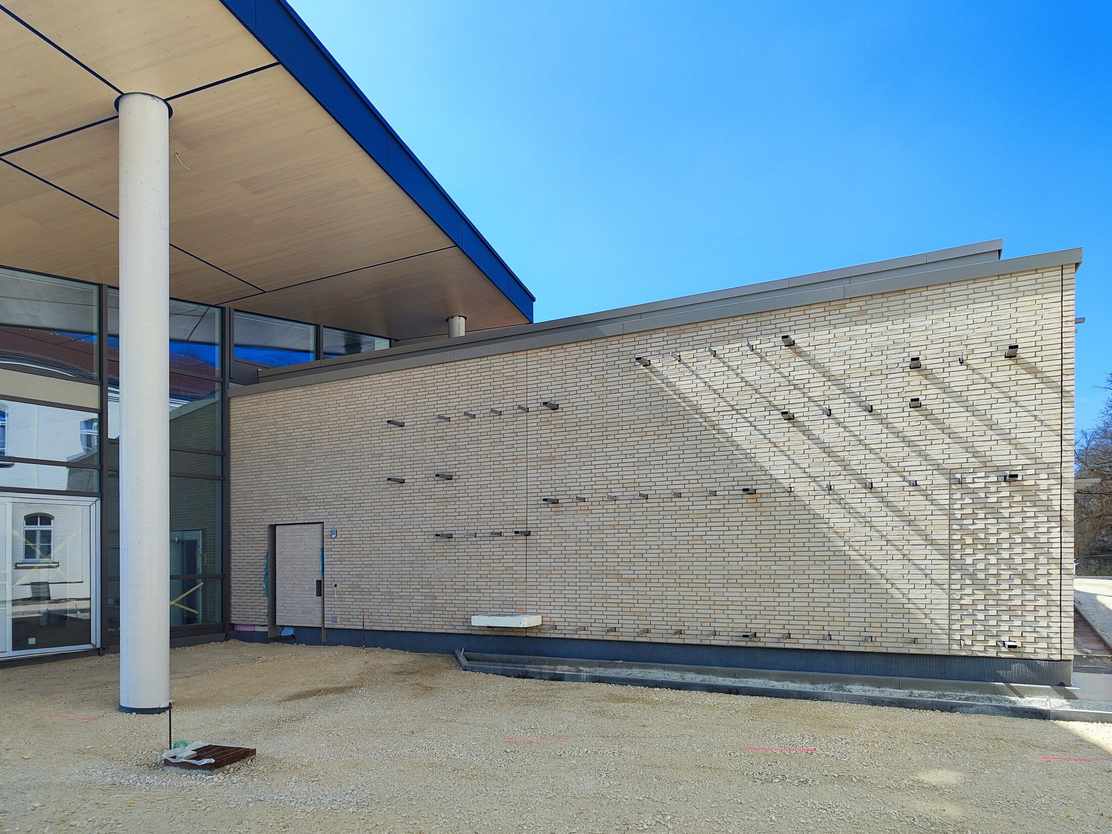The foyer and canteen feature photovoltaic roofs. Seeding herbs and other plants on the kitchen’s biodiverse roof provides both habitat and a food source for bees and insects. A greened clinker facade complements the kitchen wing to blend with its strict geometry. The construction follows a resource-efficient, purpose-driven approach: a hybrid steel-and-timber structure spans the wide canteen.