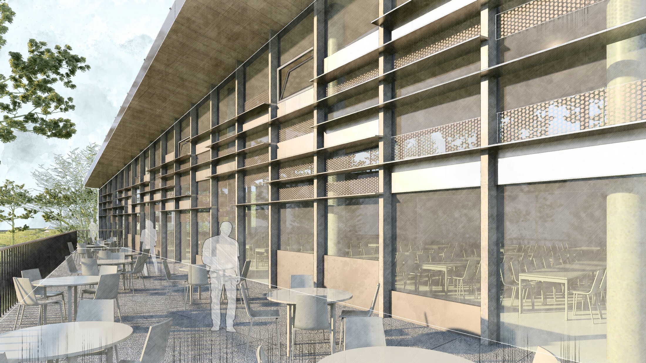 The heart of the building is the south-facing canteen on the upper level, with seating for approximately 330 people. It offers expansive views of the surrounding valley, creating the sensation of dining outdoors throughout the year. This effect is ensured by a fine interplay of transparent and opaque elements, combined with fixed external lamellae that provide protection from the sun. This sunshade system was meticulously simulated, and the optimal positioning of closed panels ensures that no movable sunscreens are required.