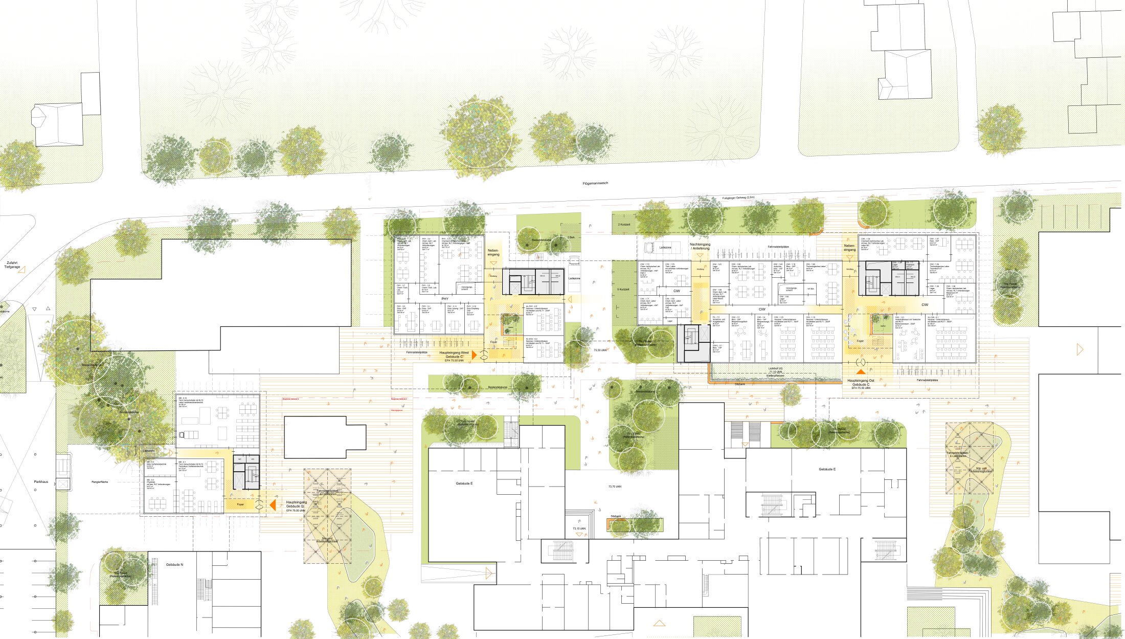 While the street frontage forms a clearly defined edge that establishes a strong architectural boundary to the city, the elevations facing the campus are more varied. Green facades strengthen the relationship between the building and its outdoor context. New and existing structures come together to form a cohesive ensemble organized around a central courtyard, which offers generous outdoor common areas for gathering, events, and informal exchange among students and faculty. Tiny forests in the courtyard and north of the parking structure offer additional retention areas.