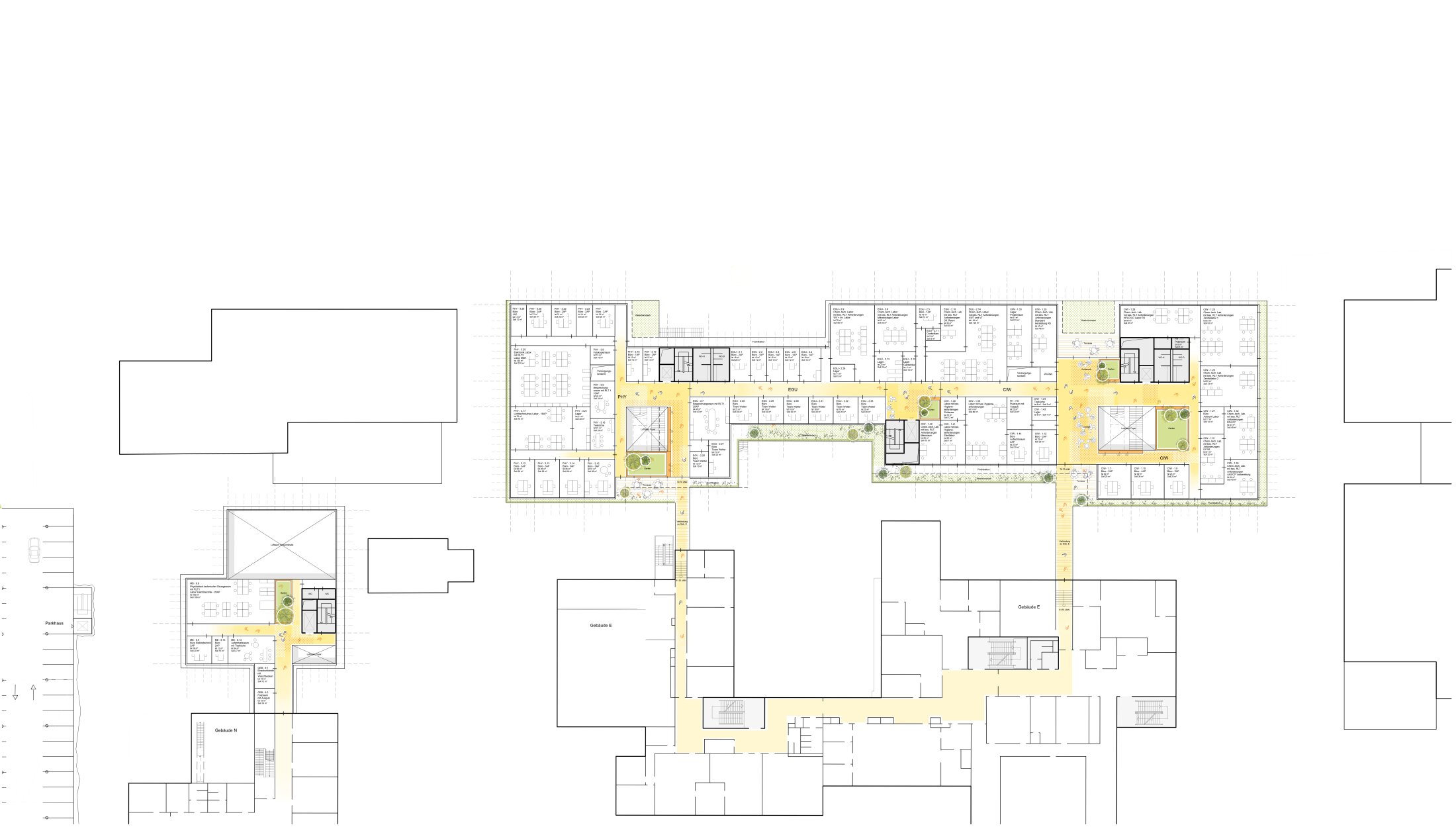A new connecting path provides the main access to the buildings and structures the entire campus. Its key nodes are marked by sheltered communal zones, outdoor teaching spaces, seating areas, and bicycle facilities. Second-story bridges link the new buildings C and Q to the adjacent existing structures, ensuring direct, efficient movement for students and staff while horizontally integrating the various building clusters into a unified whole.