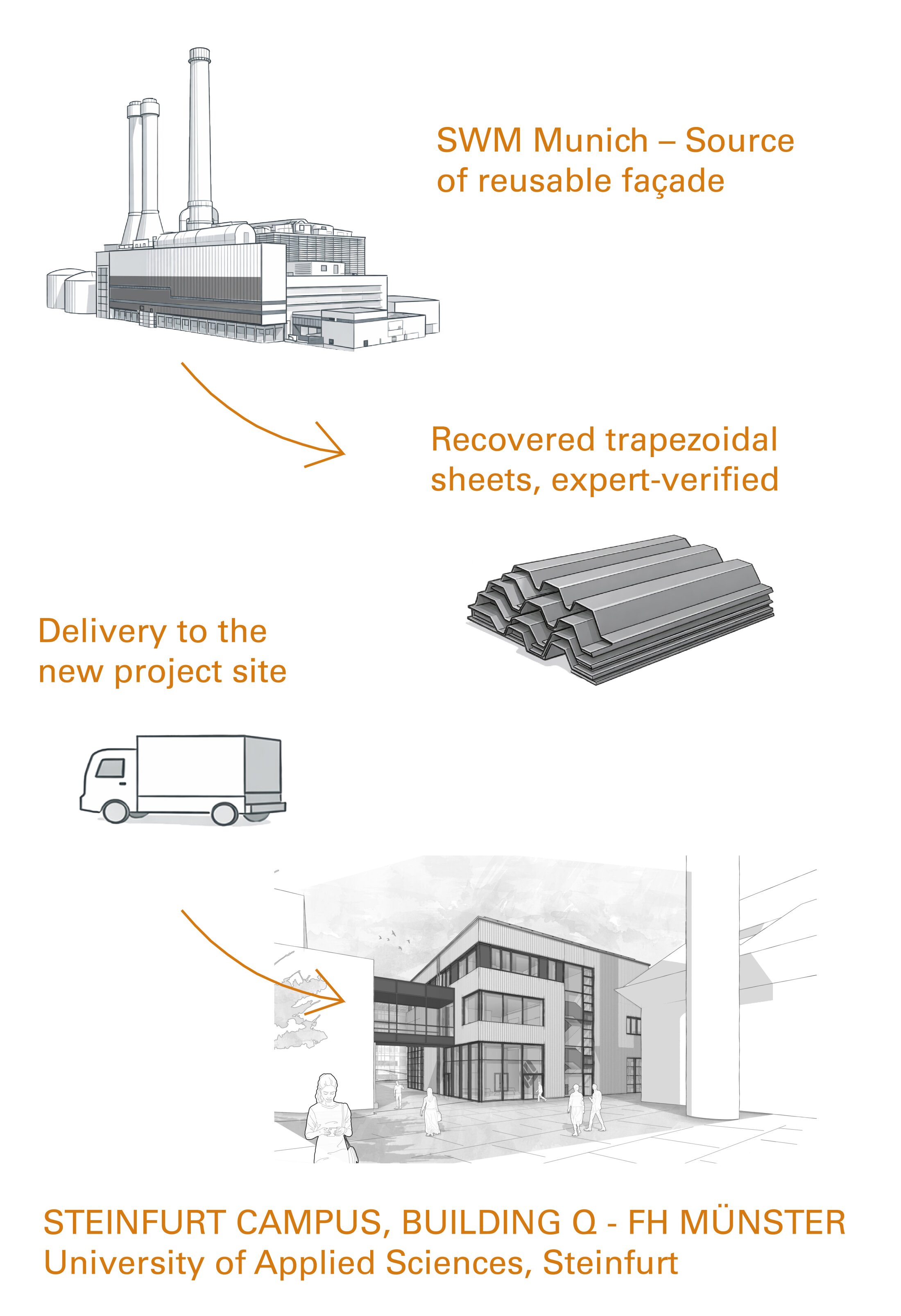 As a contribution to resource conservation, the ventilated aluminum trapezoidal sheet metal façade will be constructed using reused trapezoidal sheets. Contact was established with SWM Munich, which is dismantling a ventilated façade as part of a renovation process. Following expert assessment, this façade can potentially be reused for the new Campus Building Q. Offcut material will be repurposed into foyer furniture and planters.
