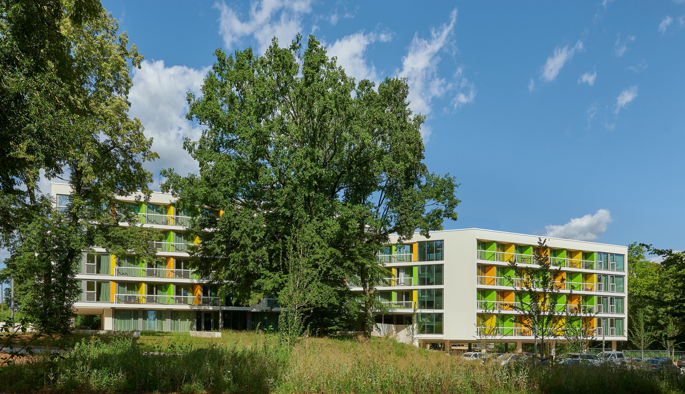 In contrast to the accented coloring of the communal areas, the individual student rooms, each with their own balcony, built-in kitchen, bathroom of finished sheet-metal components, are kept warm and tactile and are furnished with polygonal wooden furniture. Heating is provided by finned tubes — mounted vertically next to the window frames — that have an integrated ventilation system. This type of heating regulates the intake of fresh air, thus guaranteeing optimal air quality and a comfortable environment for residents. The exterior of the building is defined by the balconies’ play of light and shadow. The distinctive coloring of the closed glass panels is inspired by the seasonal color changes of the surrounding trees. The slanting elements of the facades help block the view to neighboring balconies while at the same time offering structural protection from the sun. The continuous handrail and parapets, filled with stainless-steel meshwork, reinforce the appearance of transparency and, together with the light-colored banding, give horizontal structure to the facade.